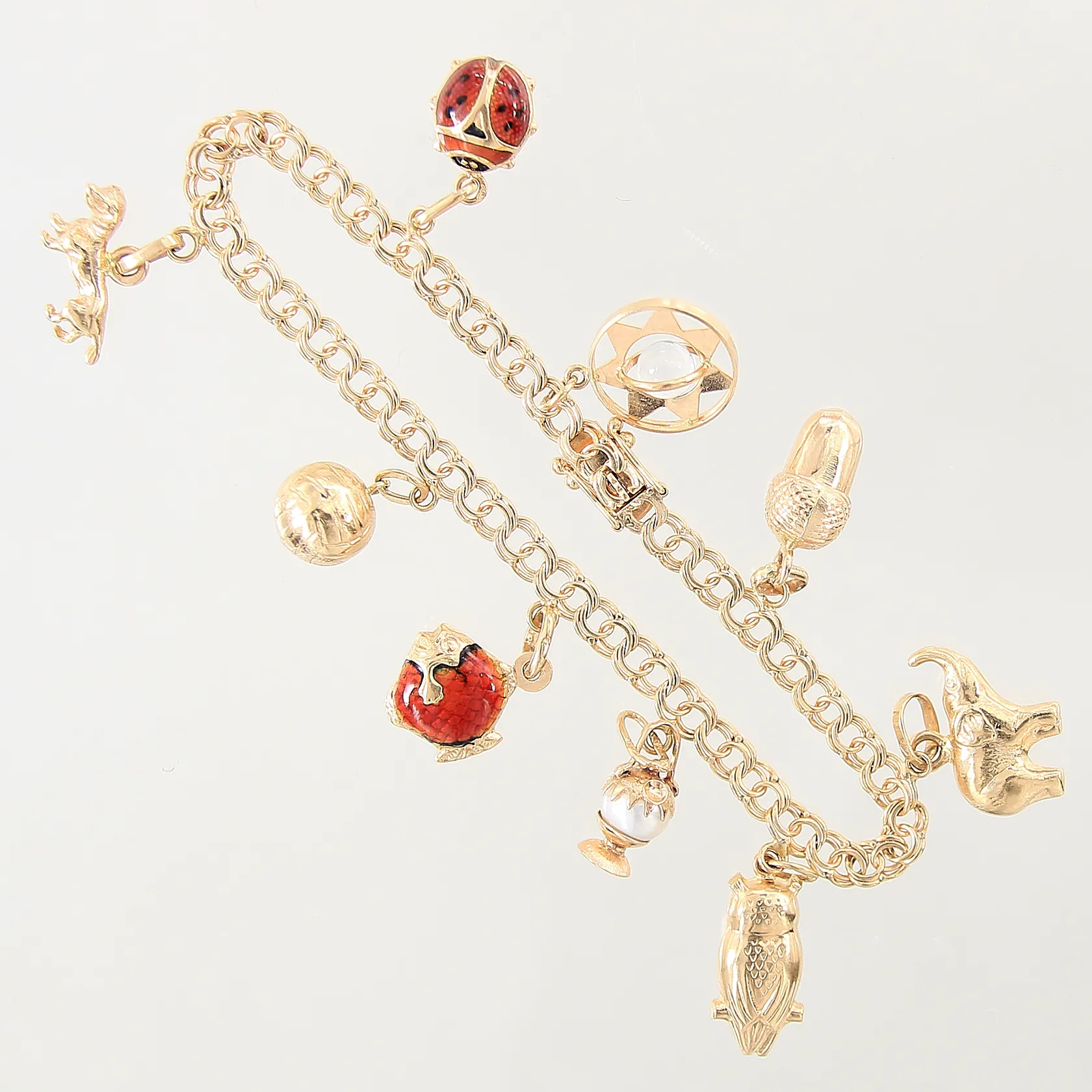 Armband Bismarck med 9 berlocker, längd: 18cm, bredd: 4,1-12,5mm, 18K Vikt: 14,1 g.