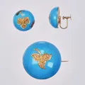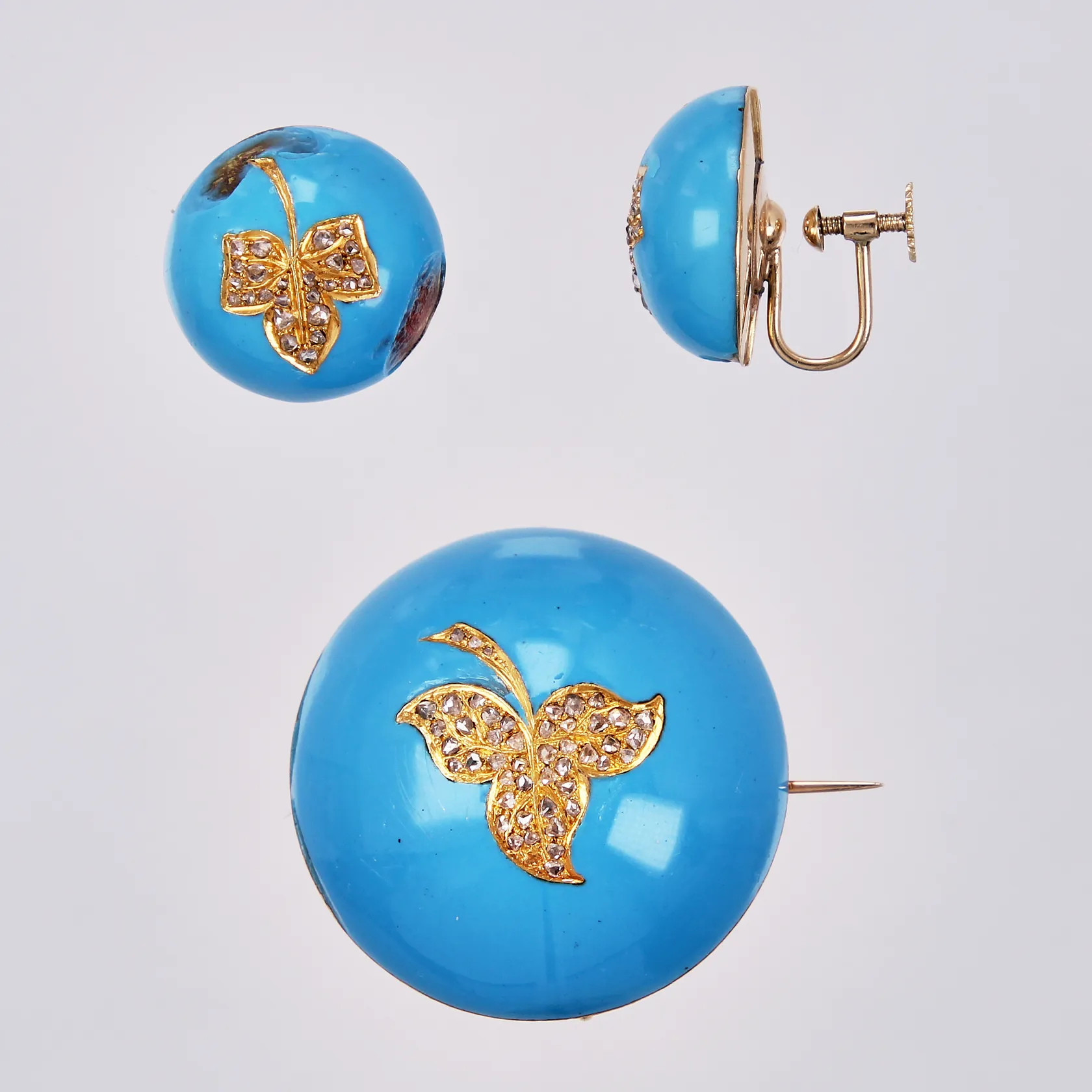 Brosch samt ett par örhängen med skruv, med rosenstenar och emalj, nagg/skador, Ø 18mm, troligen Ryssland 1800-tal, 14K guld Vikt: 27,5 g.