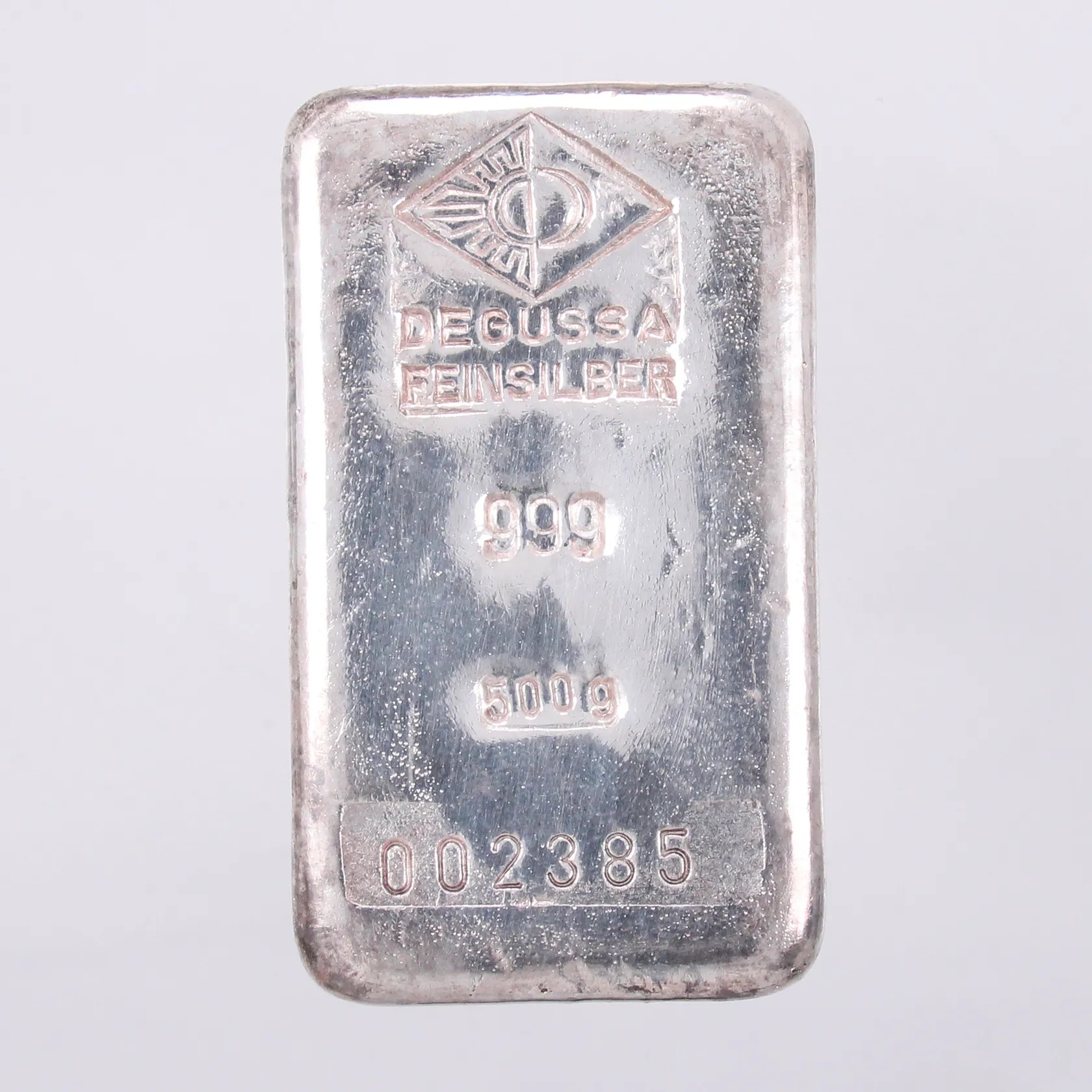 Tacka Degussa Feinsilber 40 x 69mm nr 002385 999/1000 silver Vikt: 500,8 g.