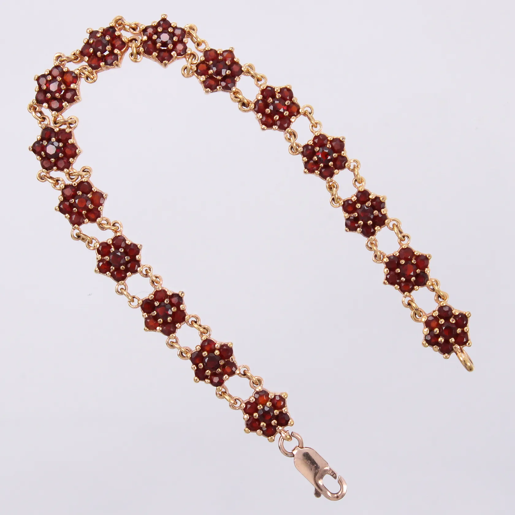 Armband med granater längd: ca 19cm bredd: ca 7mm förgyllt 925/1000 silver Vikt: 14,6 g.