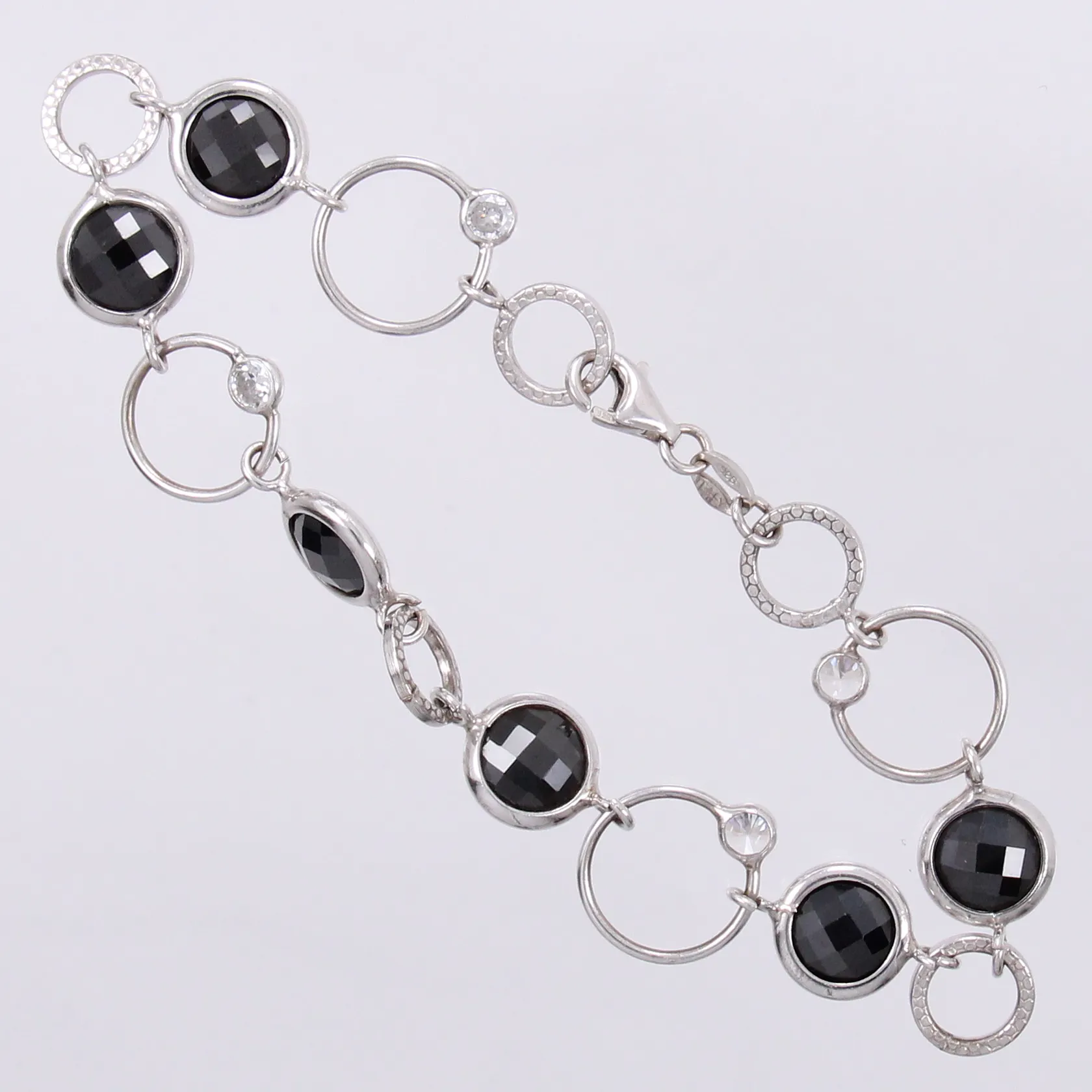 Armband med svarta/vita stenar längd: ca 19cm bredd: ca 9-12mm stämplad Italy 925/1000, silver Vikt: 10,5 g.