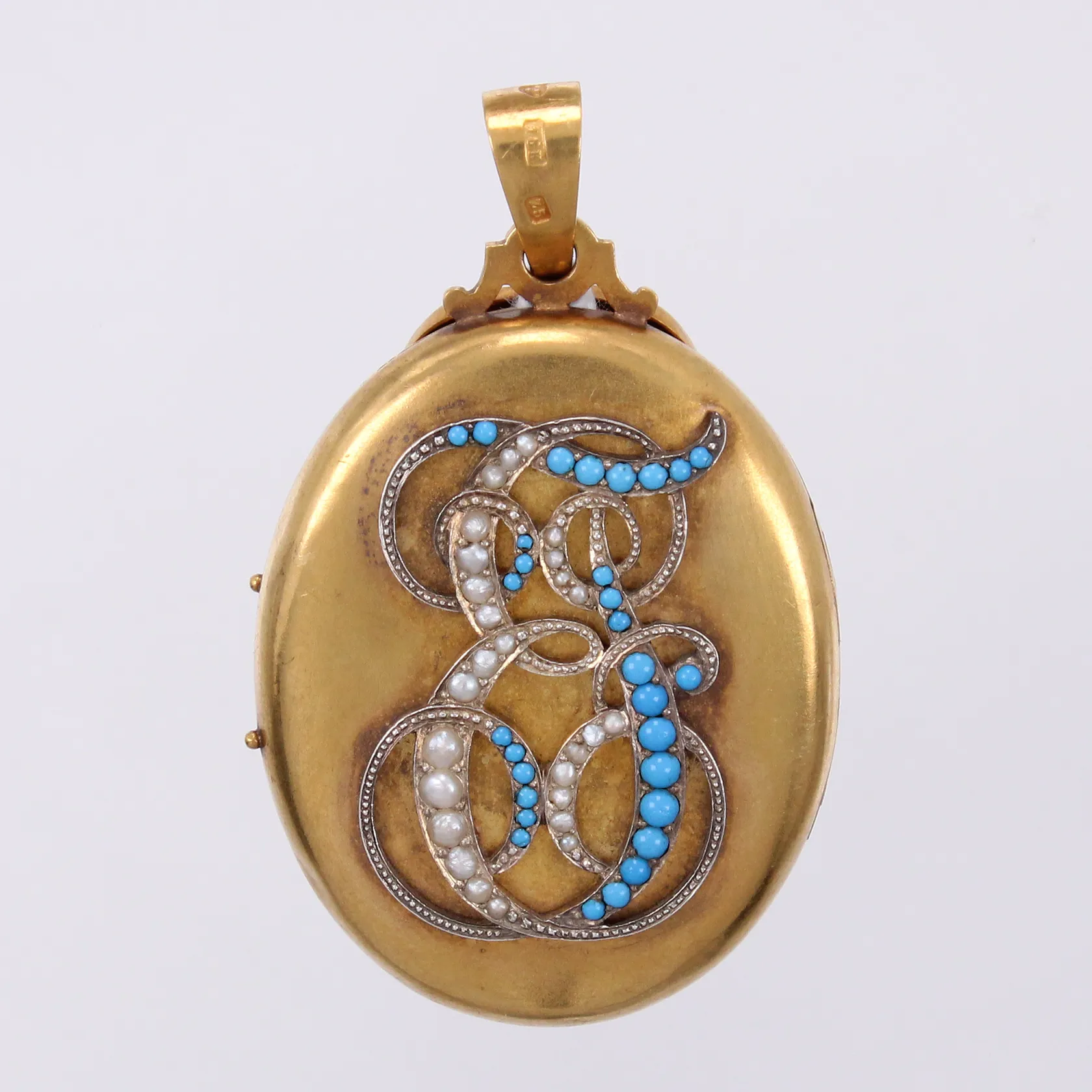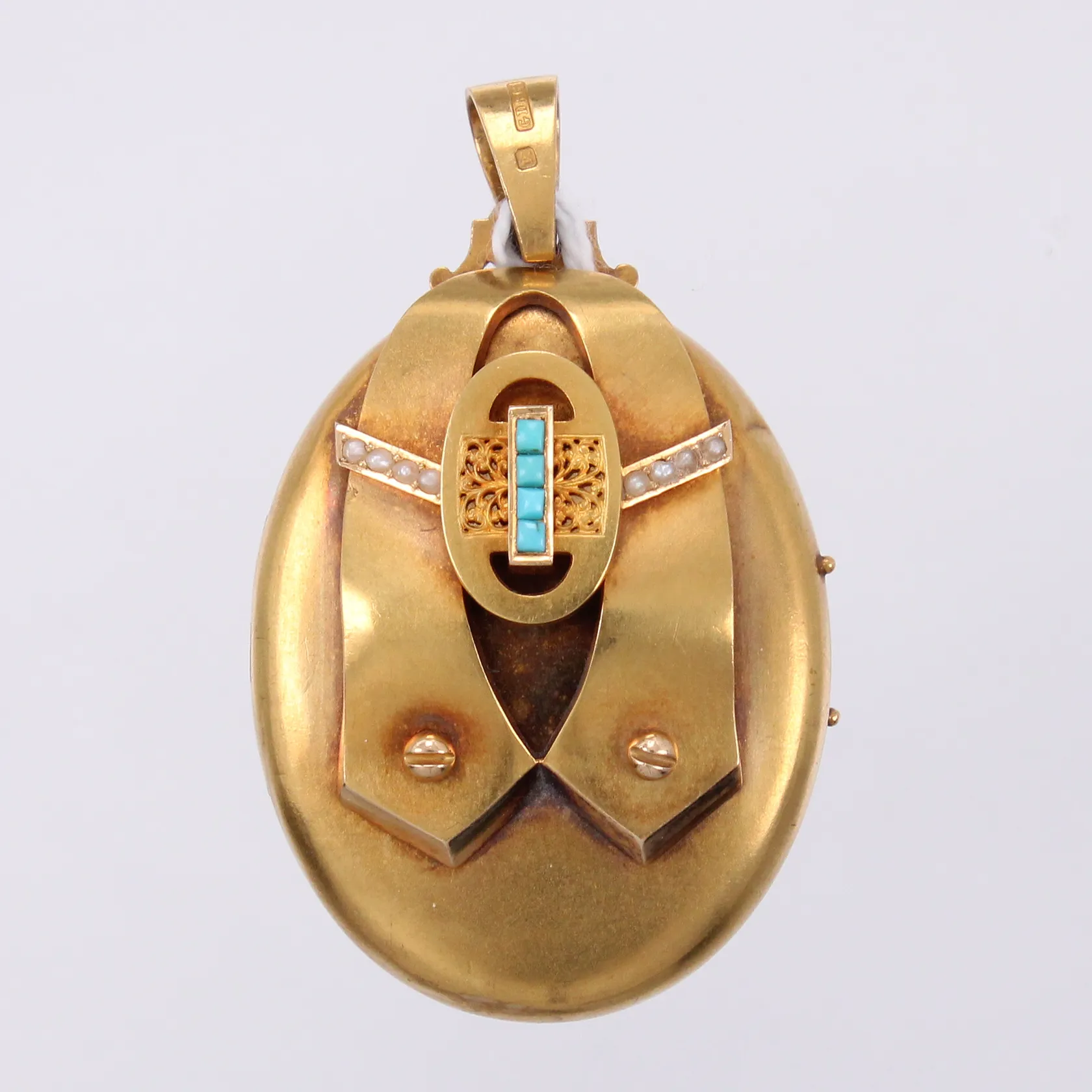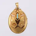 Hänge/medaljong med turkoser och äkta pärlor, längd: ca 5,5cm, bredd: ca 33mm, GD & Co, Guldvaruaktiebolaget G. Dahlgren & Co AB, Malmö, år 1878, 18K Vikt: 26,3 g.