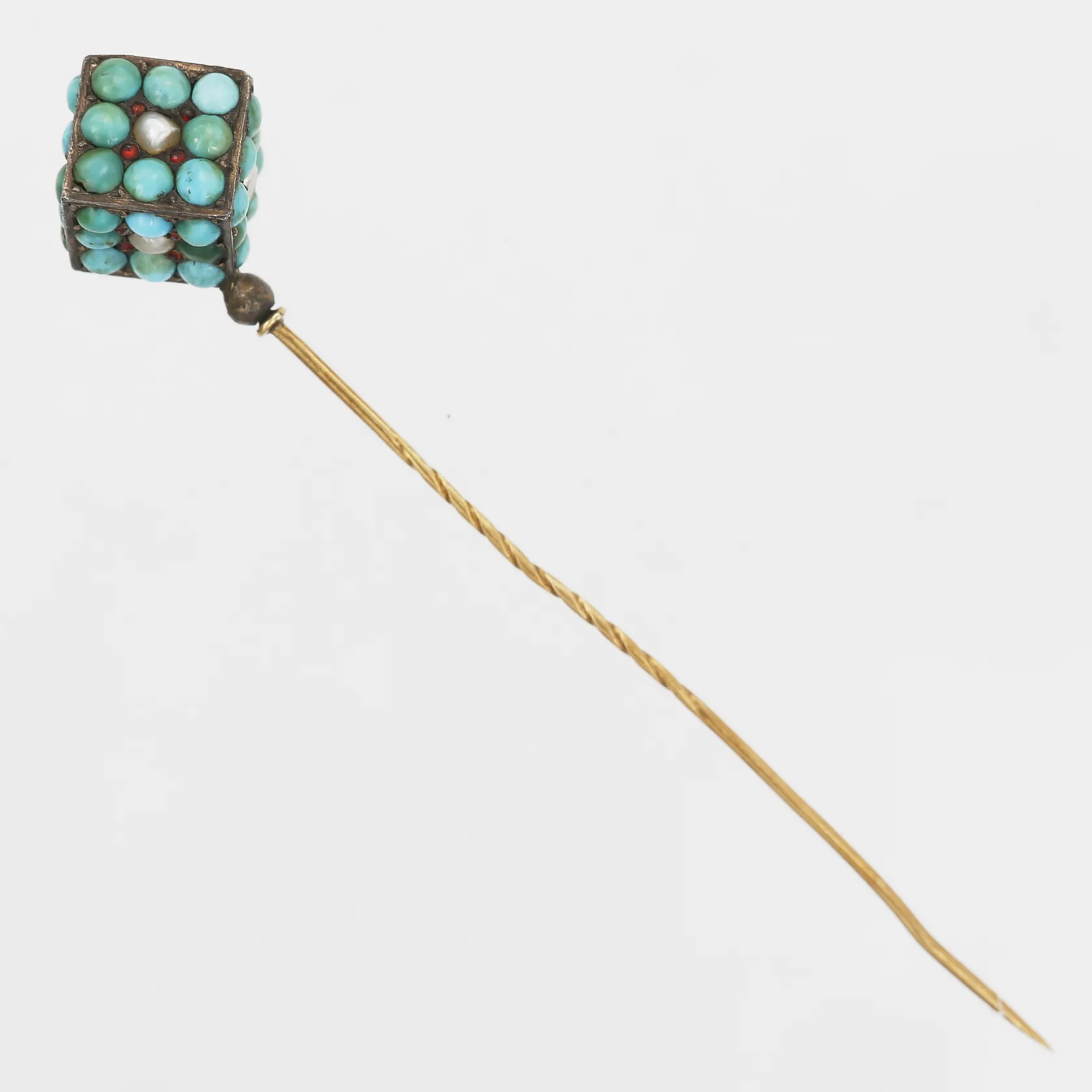 Hattnål med kub med seedpärlor, turkoser samt röda stenar, troligen granater, höjd 92mm, bredd 15mm, bucklig nål, en pärla saknas, silver samt 18K guld, bruttovikt: 5,3gr Vikt: 5,3 g.