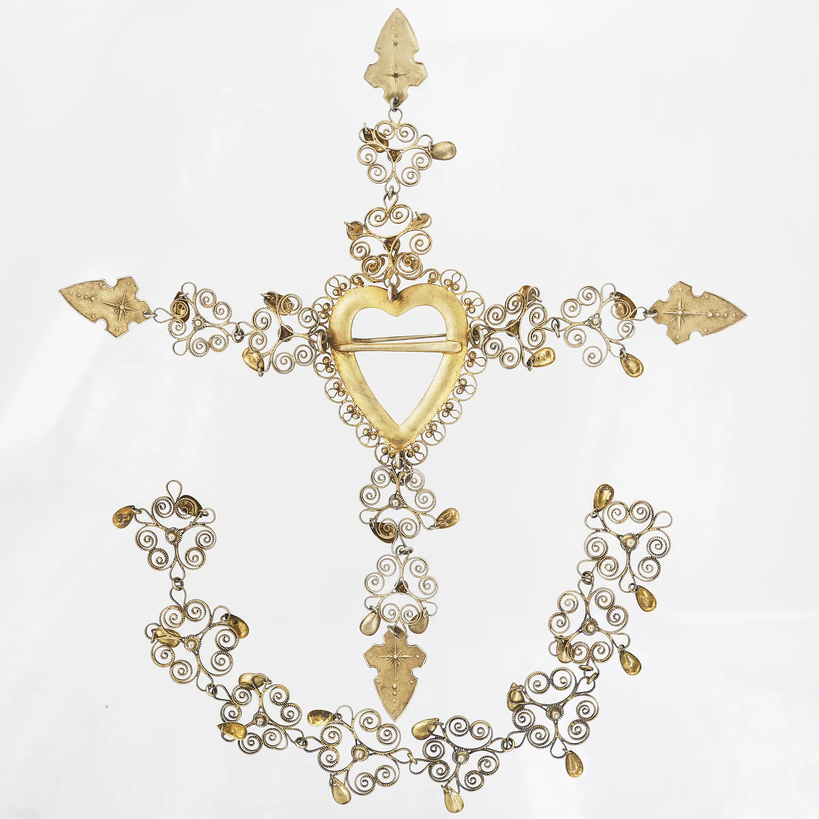 Dräktsmycke/brosch samt länkdel, höjd på brosch 14cm, bredd 6,5cm, längd på länkdel 24cm, bredd 2,5cm, bucklor, metall, tidigt 1900-tal. Vikt: 38,8 g.