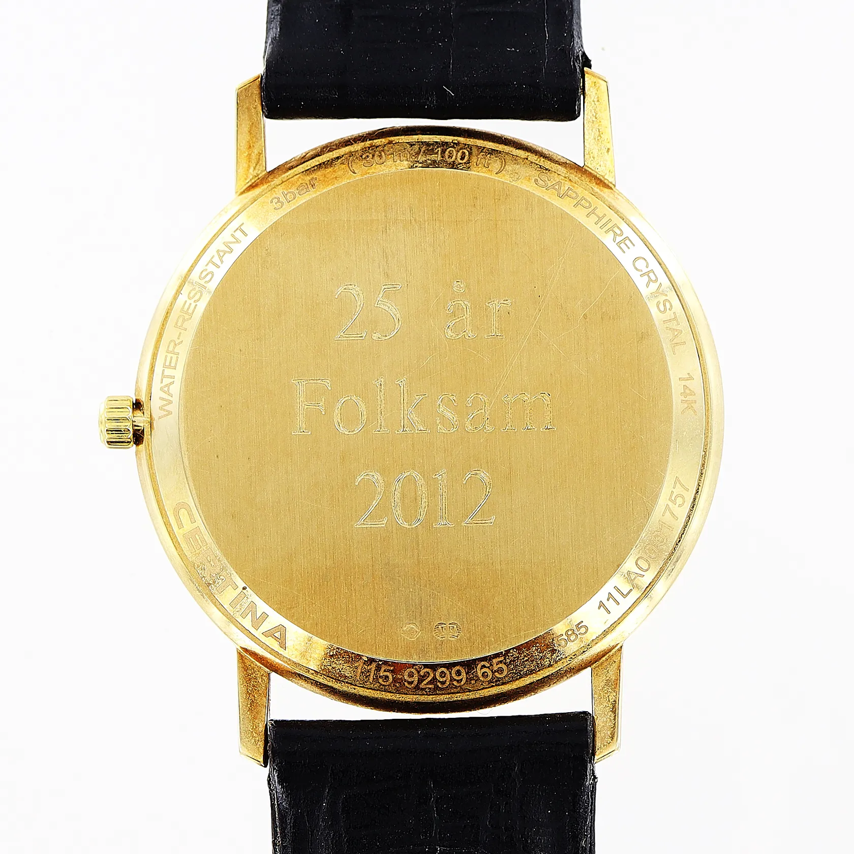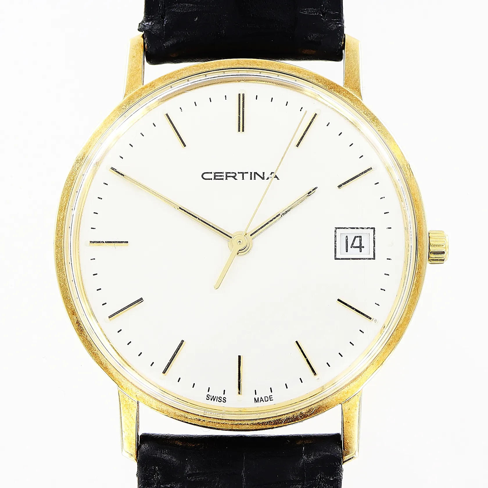 Herrur Certina 14K quartz, 33mm, datum, original läderband 25cm, törnlås, gravyr, i behov av batteribyte, inga tillbehör.
