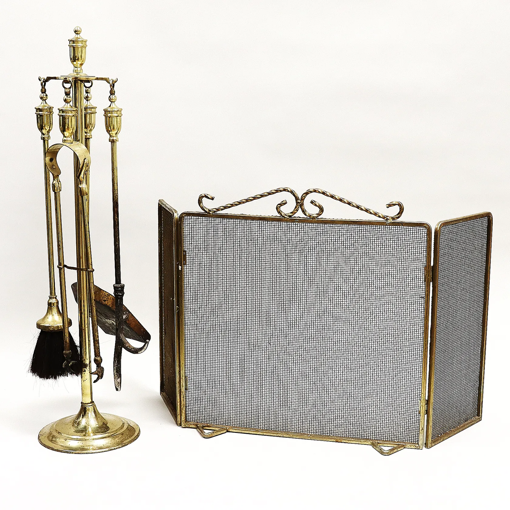 Eldställ mässing, England, fyra verktyg, höjd 70cm, smärre defekter, slitage/patina, gnistskydd metall, höjd 38cm, bredd 42-76cm, slitage/patina. Skickas med postpaket.
