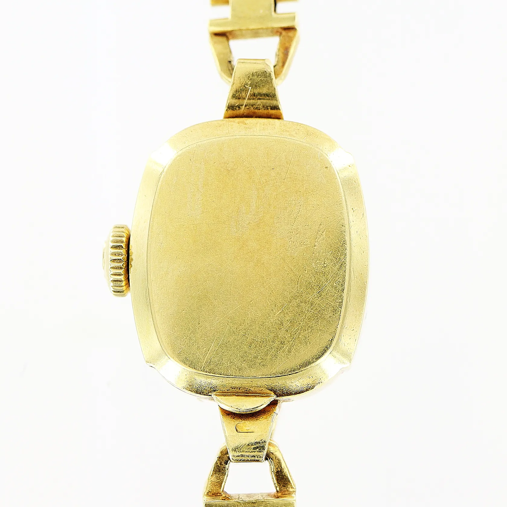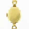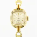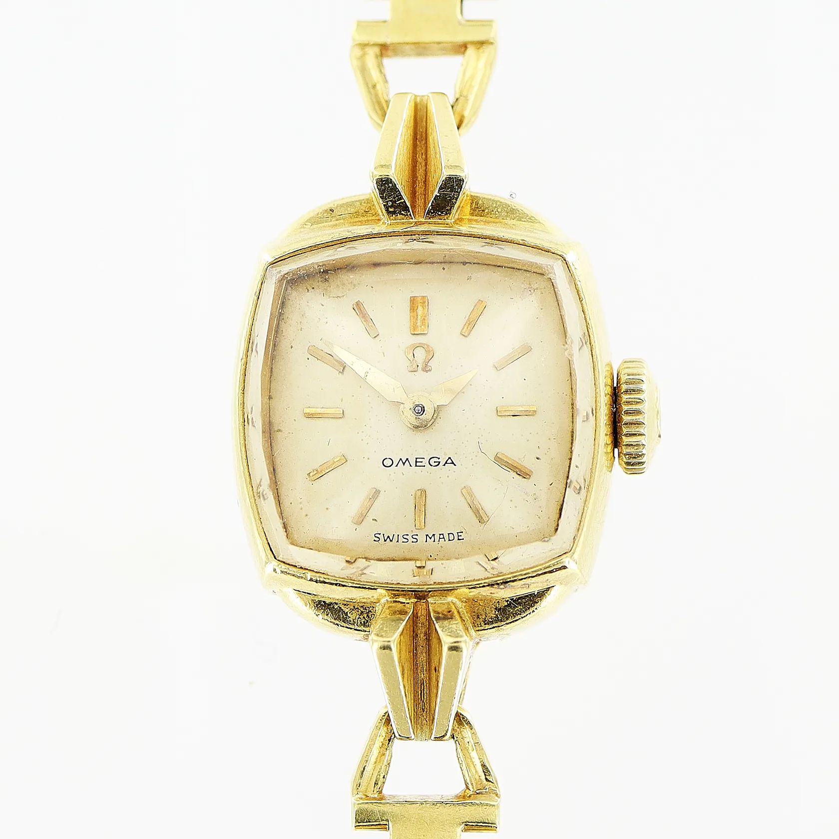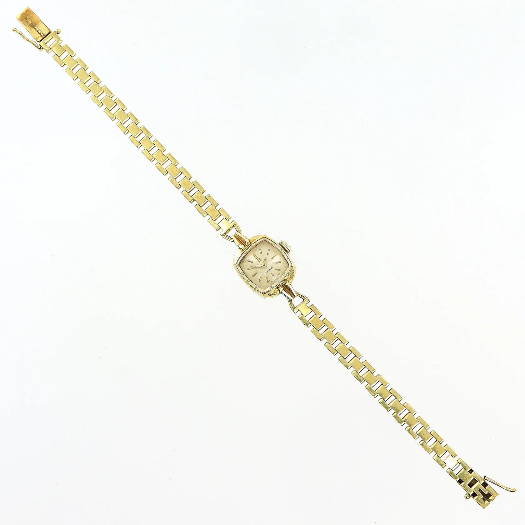 Damur Omega 18K, manuell, 14x14mm, länk 18K 18,5cm, bruttovikt 22,7gram, fläckar på urtavla, originaletui.
