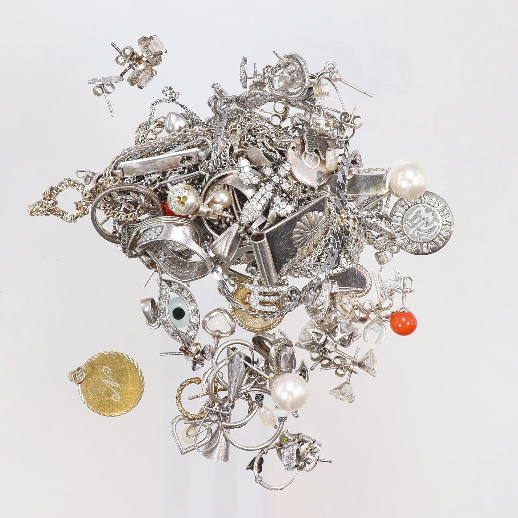 Diverse silver, slitet/defekt/graverat, 830-925/1000, bruttovikt 117,2g Vikt: 117,2 g.