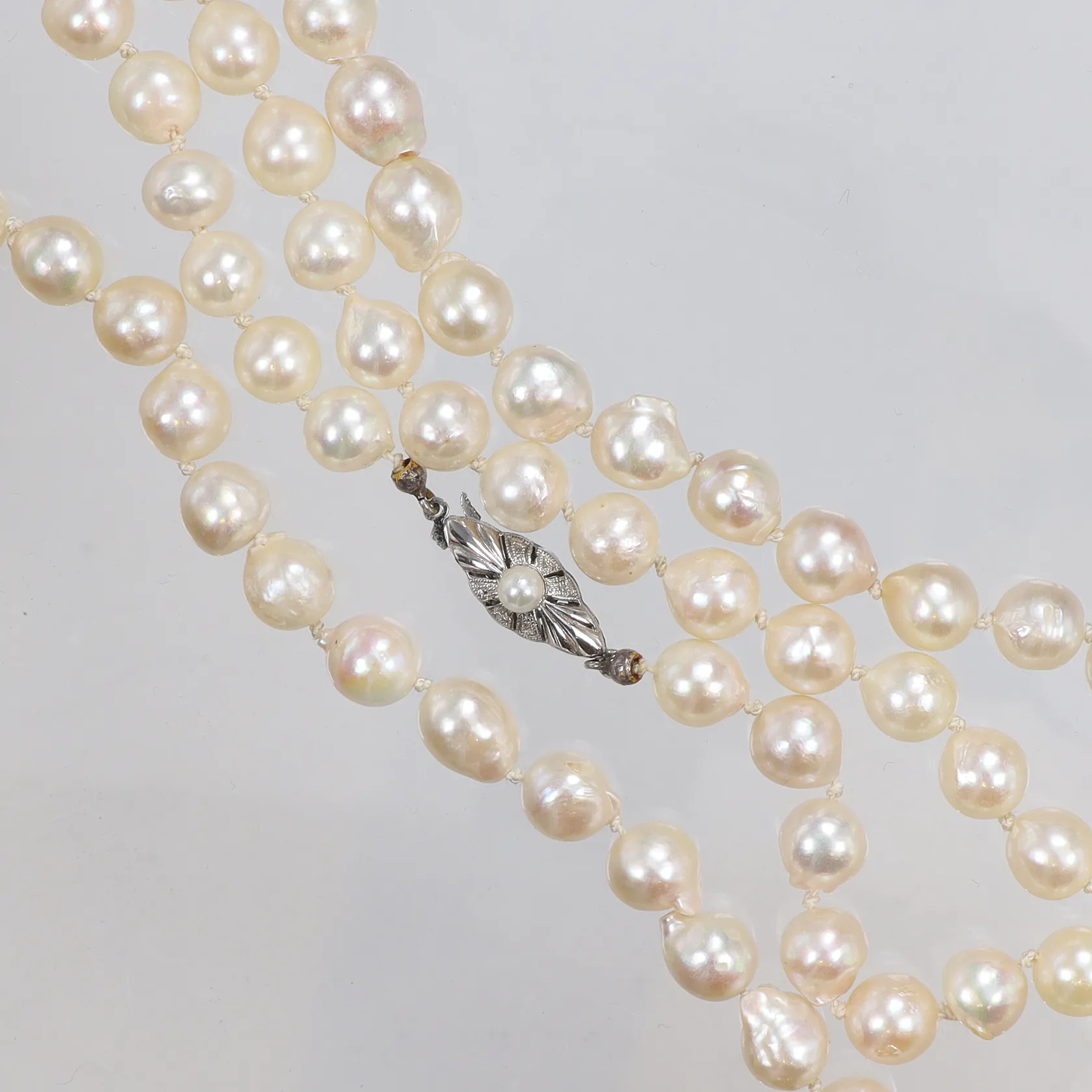 Pärlcollier med odlade saltvattenpärlor, troligen Akoya caØ7,2-7,8mm, ojämn form, längd 164cm lås i silver 835/1000 Vikt: 111,3 g.