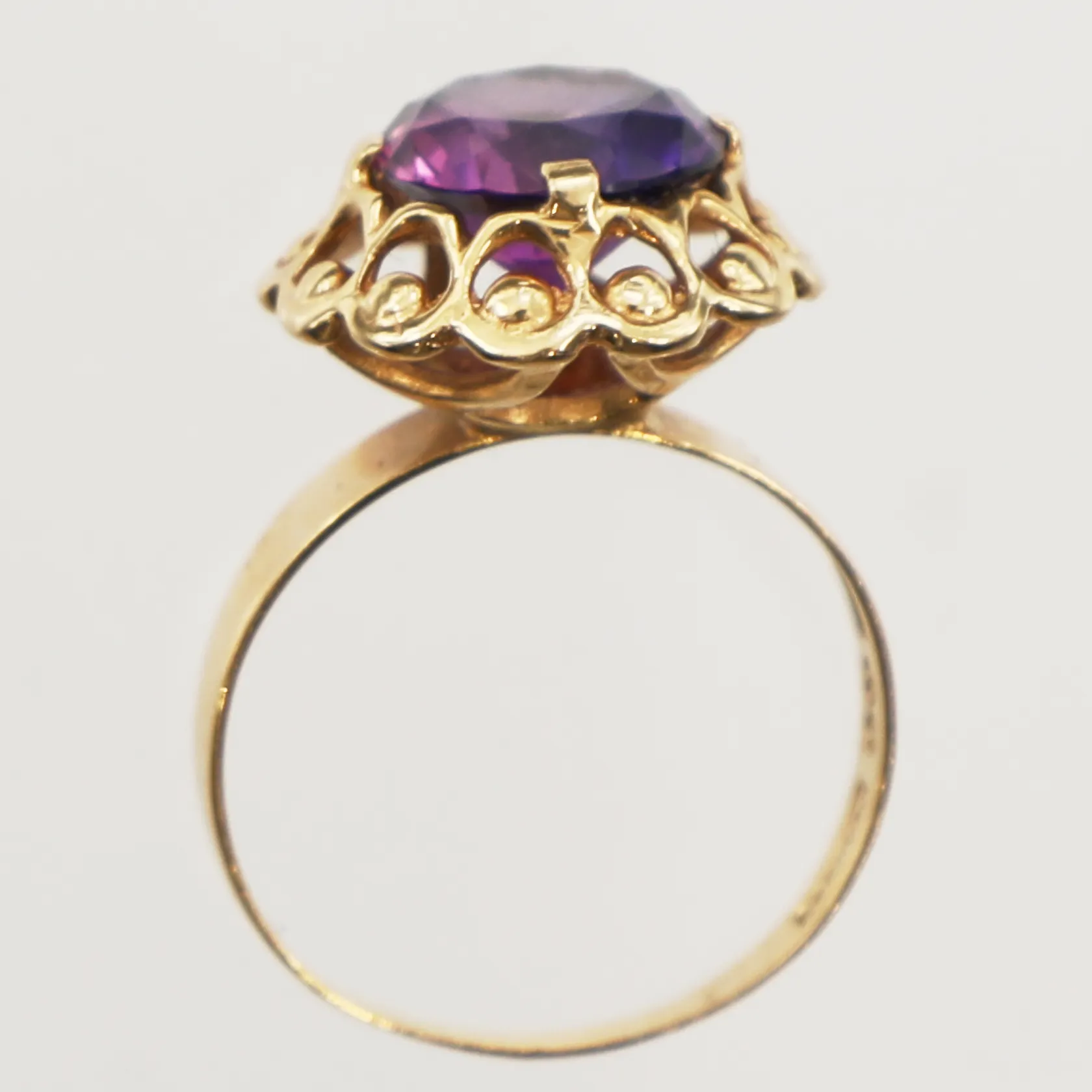 Ring med lila syntetisk safir ca 4,40ct, stl:18¾, bredd 1,9-15,8mm, Alton Falköping 1973, 18K. Vikt: 4,8 g.