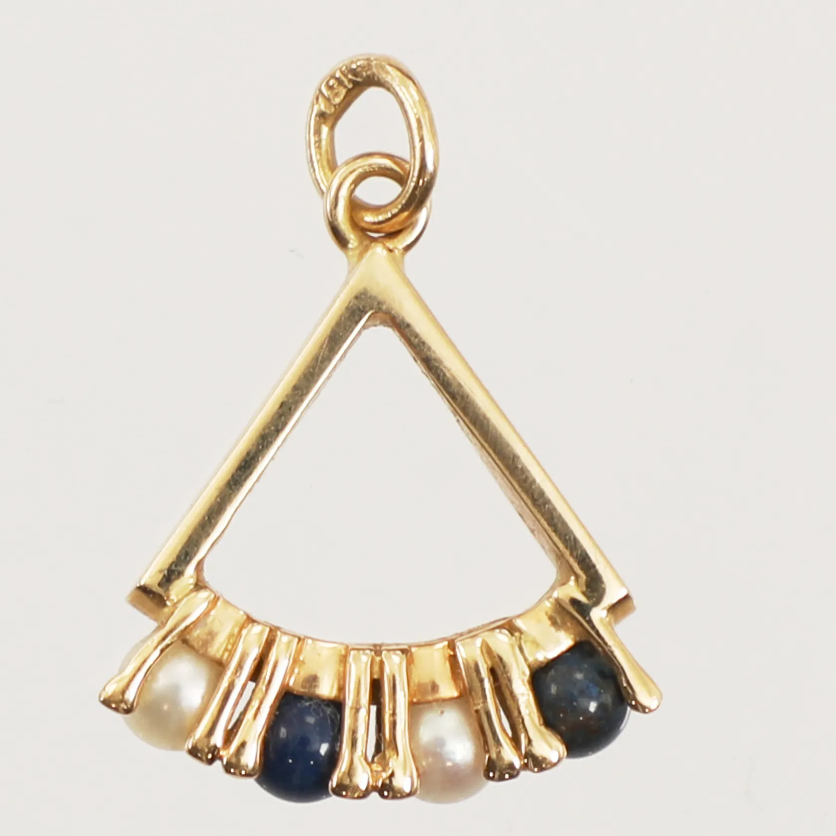 Hänge med blå stenar och pärlor, längd 23mm inklusive ögla, bredd 16mm, 18K Vikt: 3,5 g.