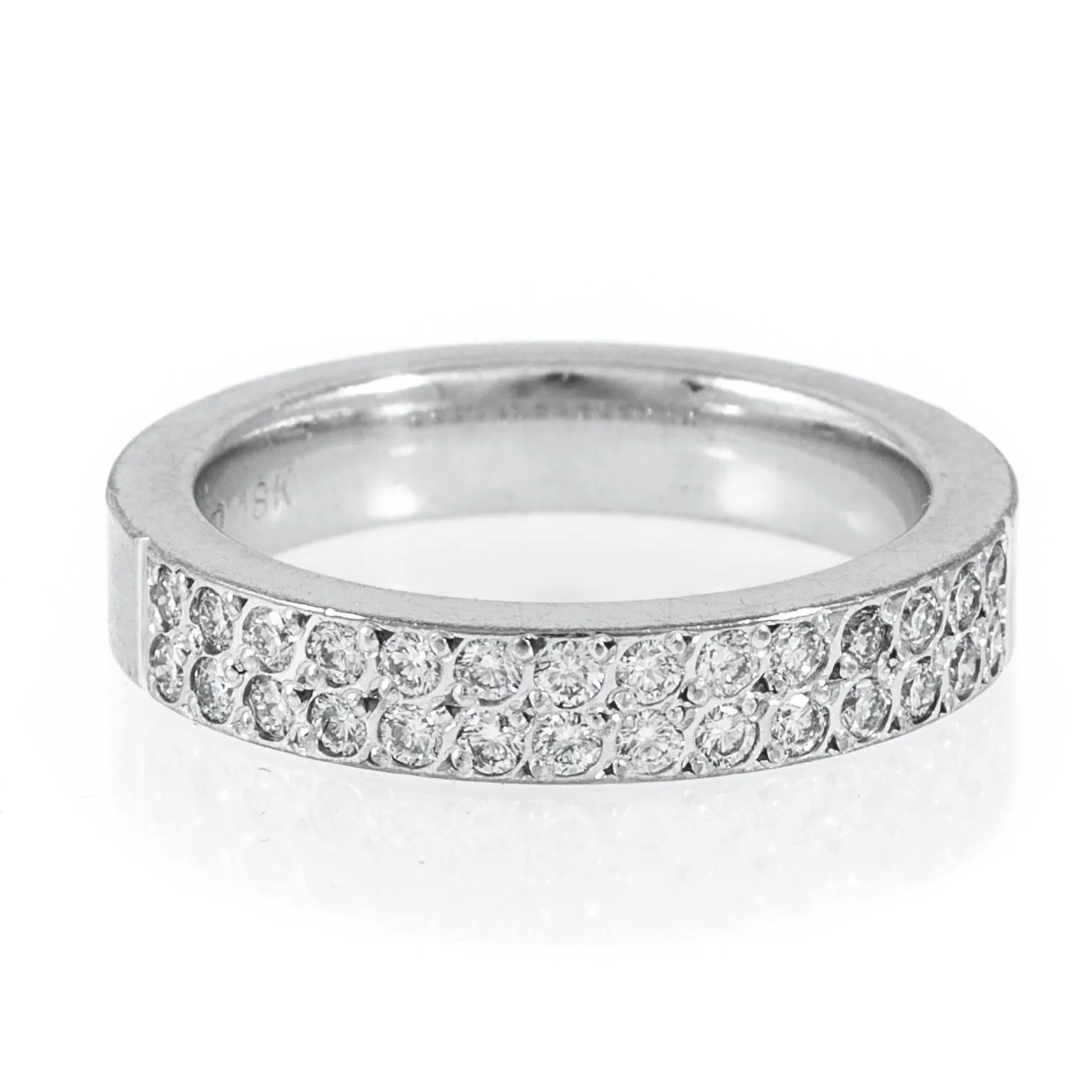 Ring i 18K vitguld med 28 x 0,02ct briljantslipade diamanter. Stl:17, 4 mm bred, 2,4 mm hög. Kupad insida. Stenstorlek 0,56ct ingraverat. Stämplad SCH (Schalins Ringar AB, Östersund), 18K och kattfot. Fint skick! Vikt: 7,5 g.