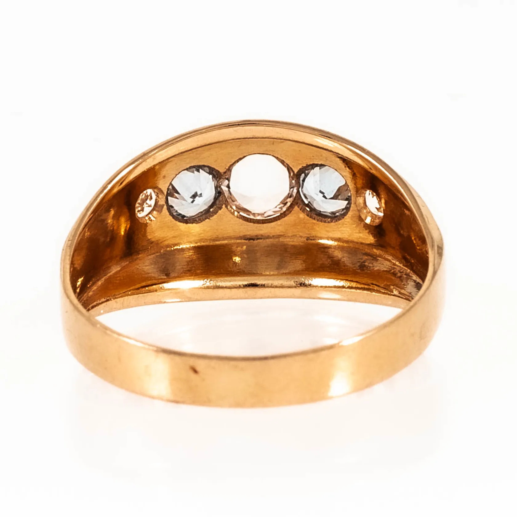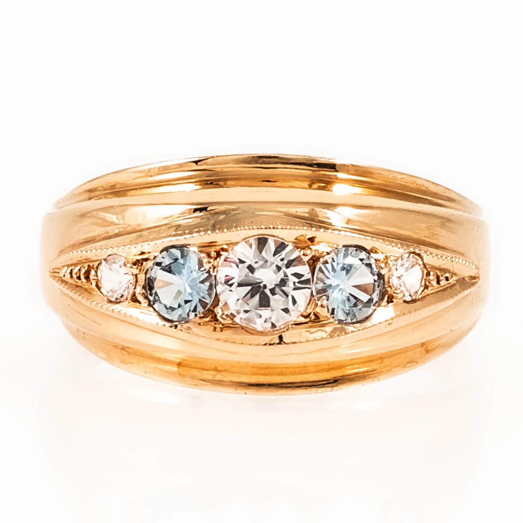 Kupad ring i 18K guld med ljusblå och vita syntetiska spineller. Stl:18, 3 - 10 mm bred, 2,9g. Tillverkad 1961 av Ljungström Guldvarufabrik AB i Stockholm. Fint skick! Vikt: 2,9 g.