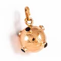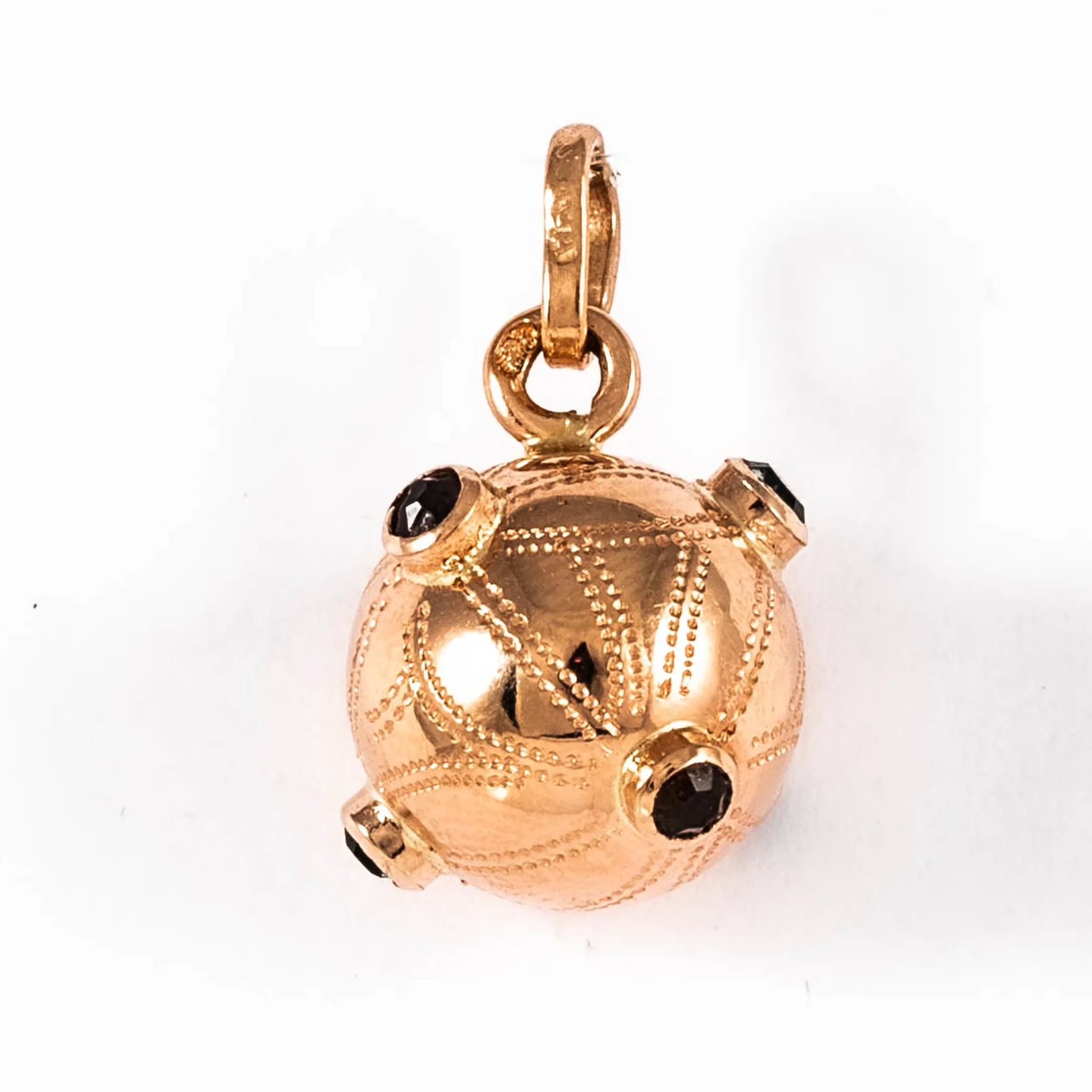 Hänge kula med olikfärgade stenar och ett graverat mönster i 18K guld. Den är Ø 11 mm och väger 2,1g. Vikt: 2,1 g.