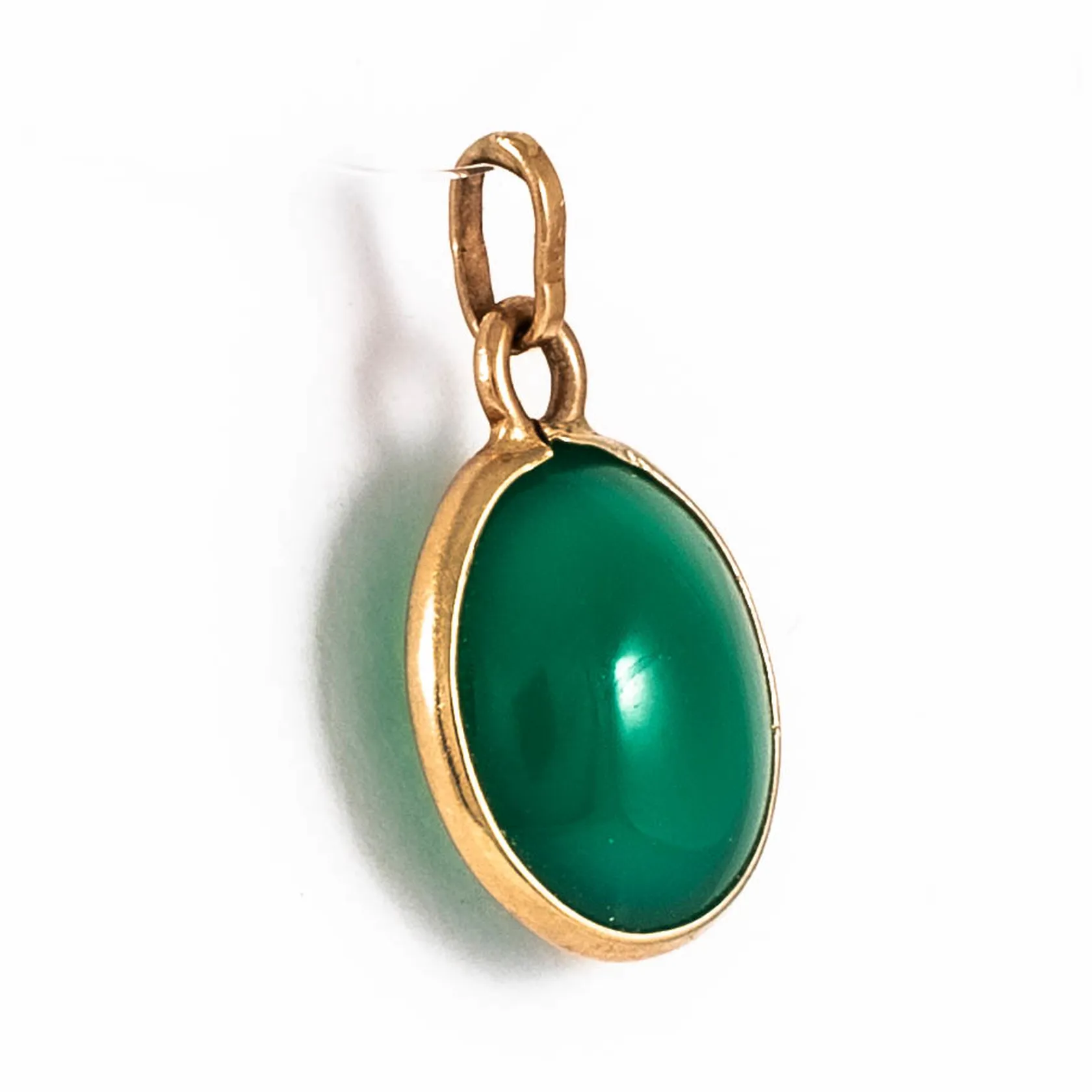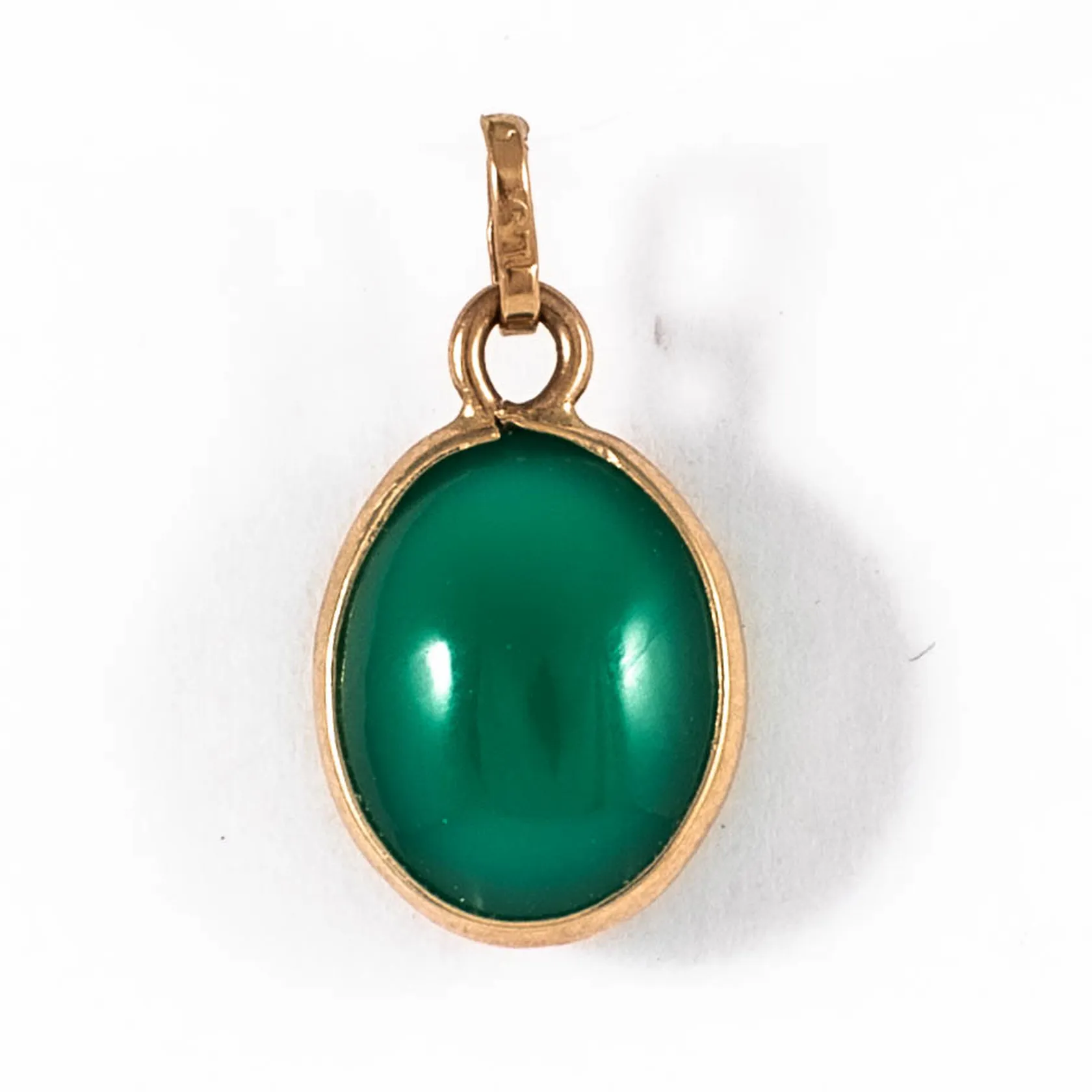 Hänge i 18K guld med en grön syntetisk sten. Majs månadssten. Den är 16,8 mm lång inkl. ögla och väger 0,8g. Vikt: 0,8 g.