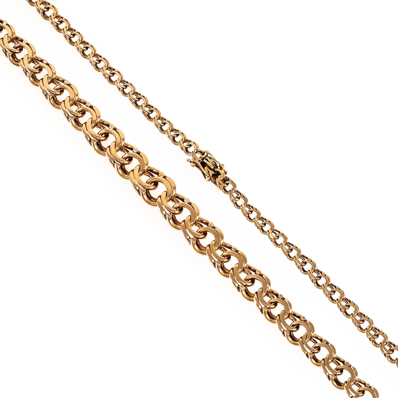 Collier Bismarck i 18K guld. Det är 45 cm långt, 4,5 - 10,5 mm brett och väger 37,4g. Kistlås. Tillverkad 1964 av Svenska Guldvaruaktiebolaget. Kattfot. Aningen mörk i tonen. Vikt: 37,4 g.