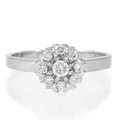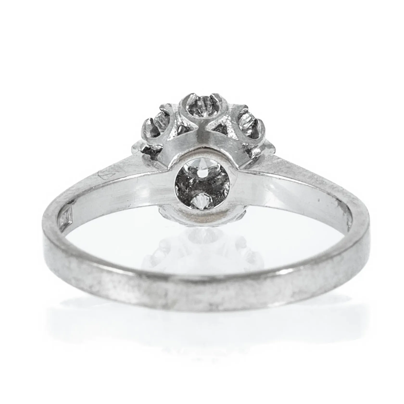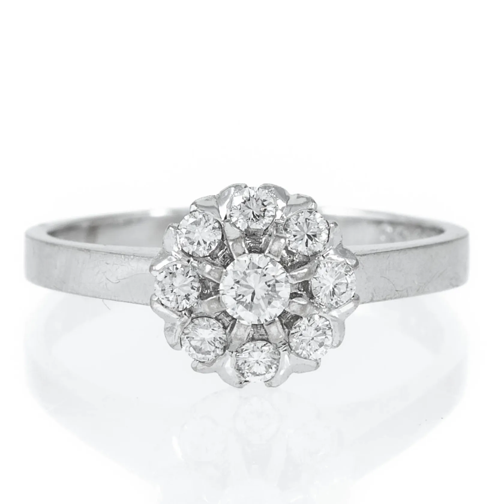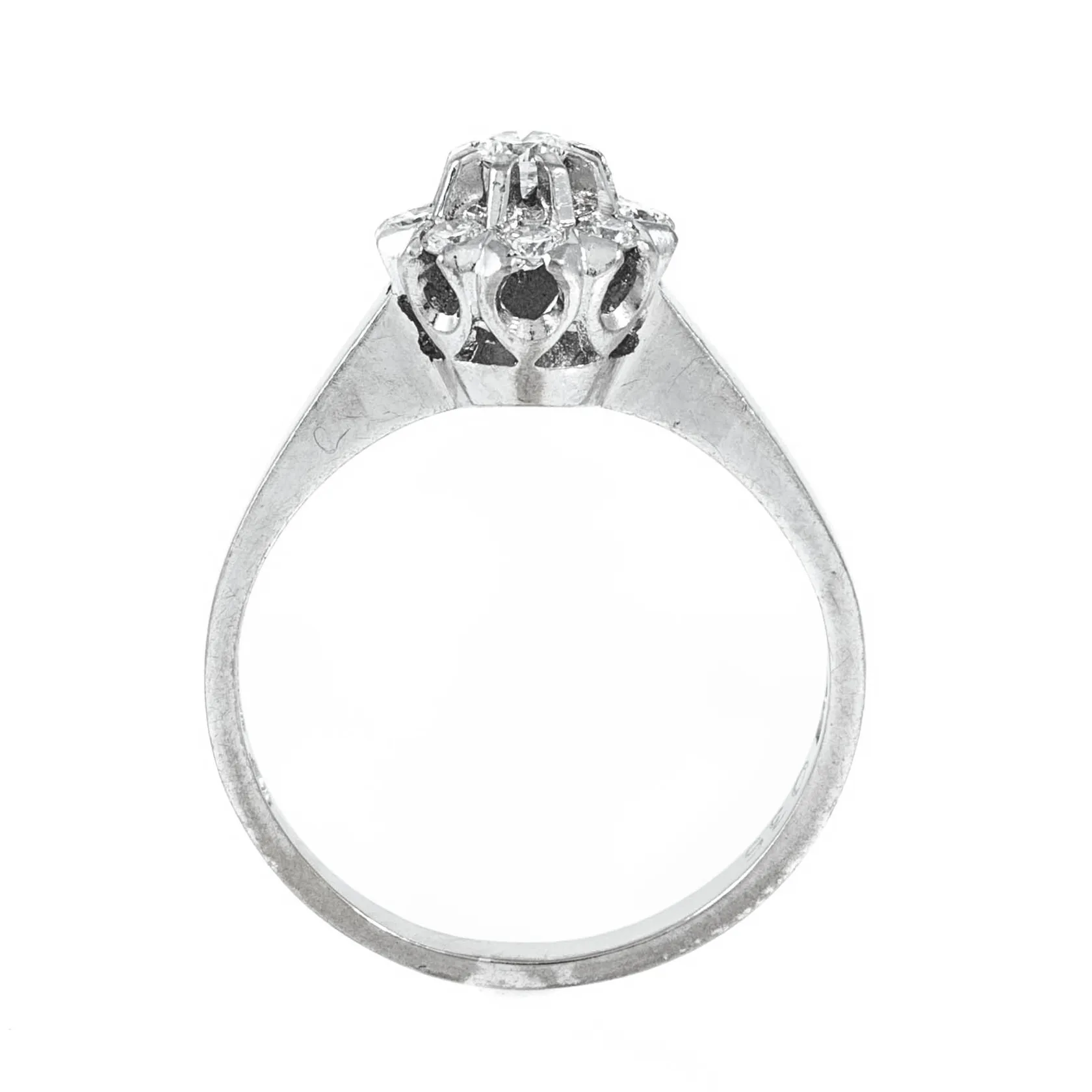Carmoséring i 18K vitguld med 1 x c:a 0,11ct och 8 x c:a 0,03ct briljantslipade diamanter. Fin lyster på stenarna. Den är i stl:17½, är 2 - 9 mm bred och väger 4,1g. Stenstorlek 0,35ct ingraverat. Stämplad A10 (1975), GD&Co (Guldvaruaktiebolaget G. Dahlgren & Co AB, Malmö), 18K och kattfot. Vikt: 4,1 g.