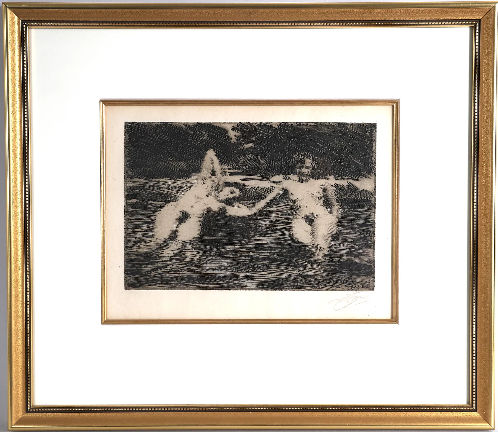Tavla, etsning, Anders Zorn, "Najader", utförd 1918, signerad med blyerts, Asplund 282, plåtstorlek 15,8 x 23,5 cm, mindre gulnad, några fläckar, ej examinerad ur ram. Skickas med postpaket.