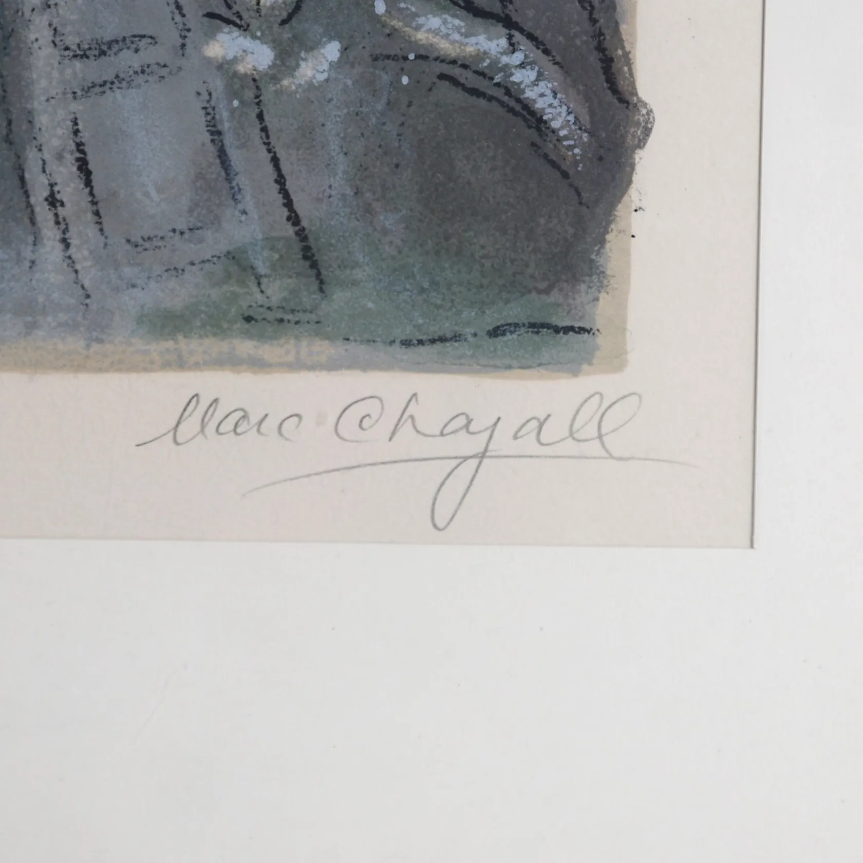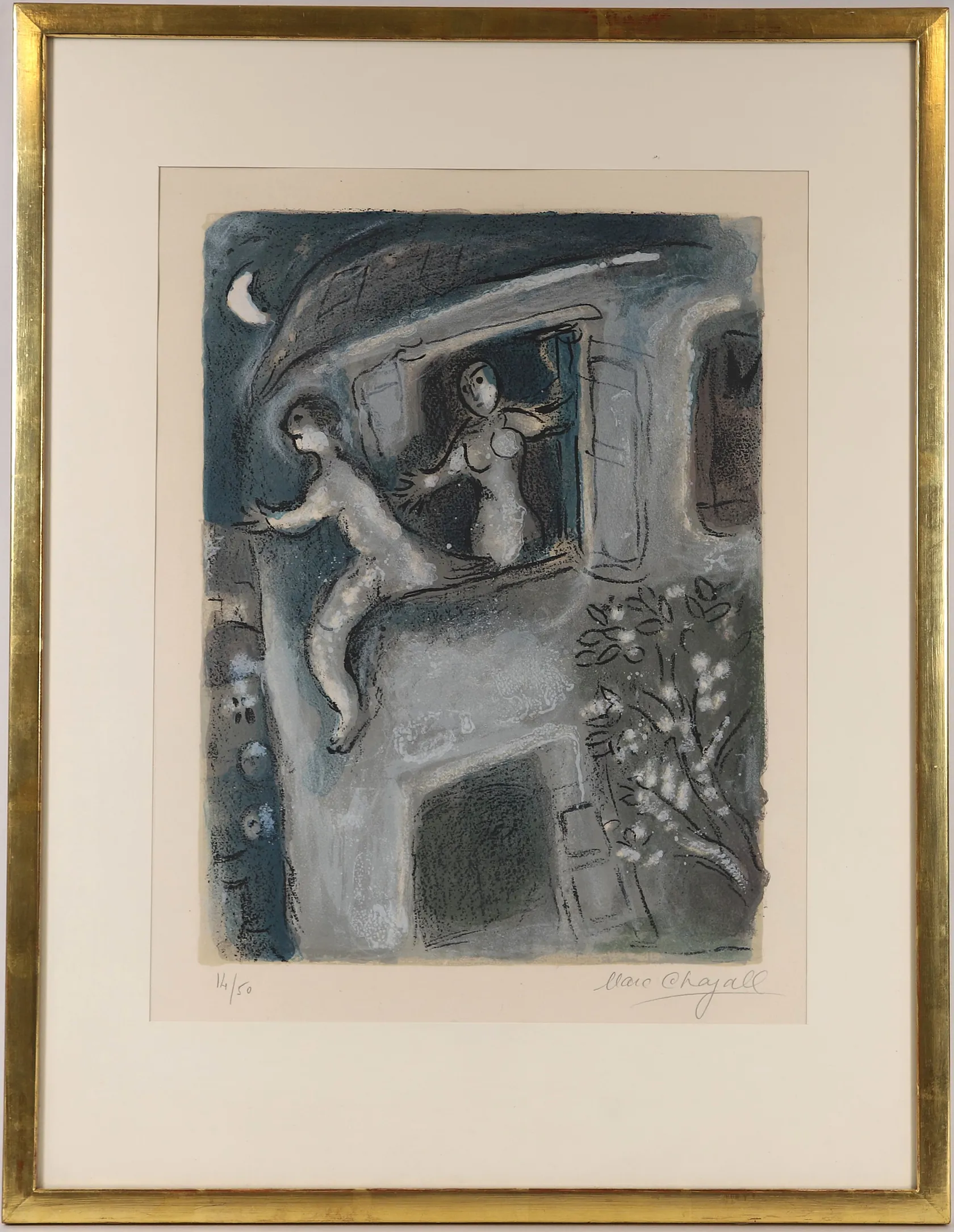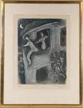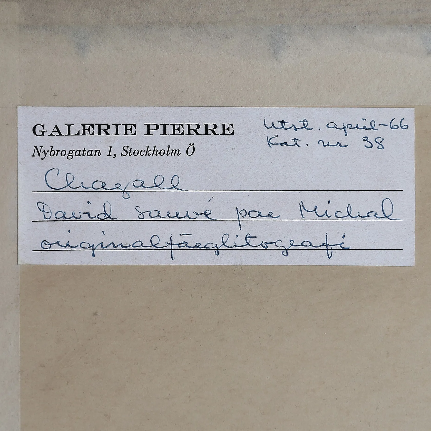 Tavla, litografi, Marc Chagall, "David sauve par Michael" ur Dessins pour la Bible, 1960, signerad och numrerad 14/50, bildyta 35,8 x 26,9 cm, enligt etikett a tergo inköpt 1966 hos Galerie Pierre, Nybrogatan 1, Stockholm, ej examinerad ur ram, mindre gulnad, enstaka mindre fläckar. Skickas med postpaket. Omfattas av BUS-avgift.