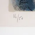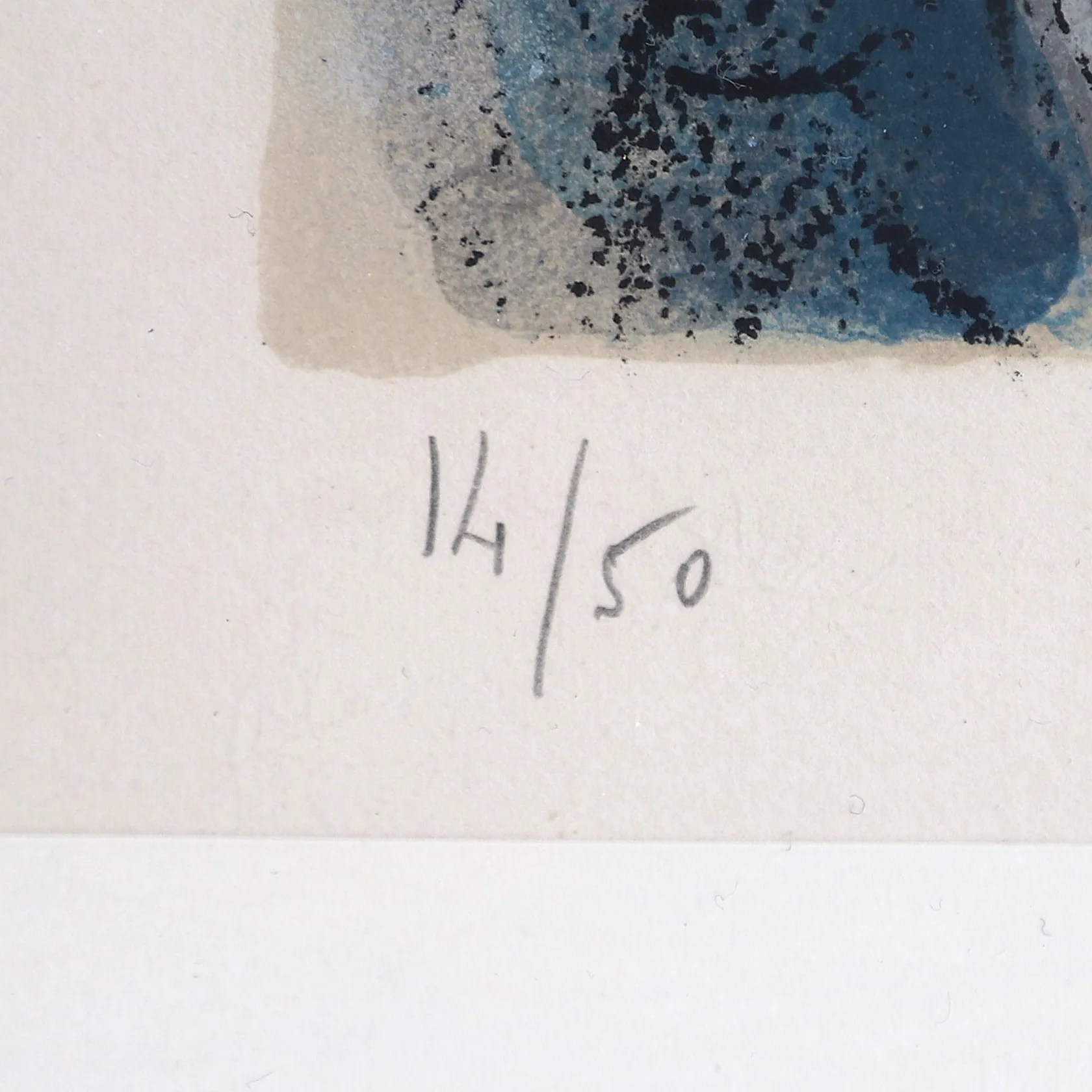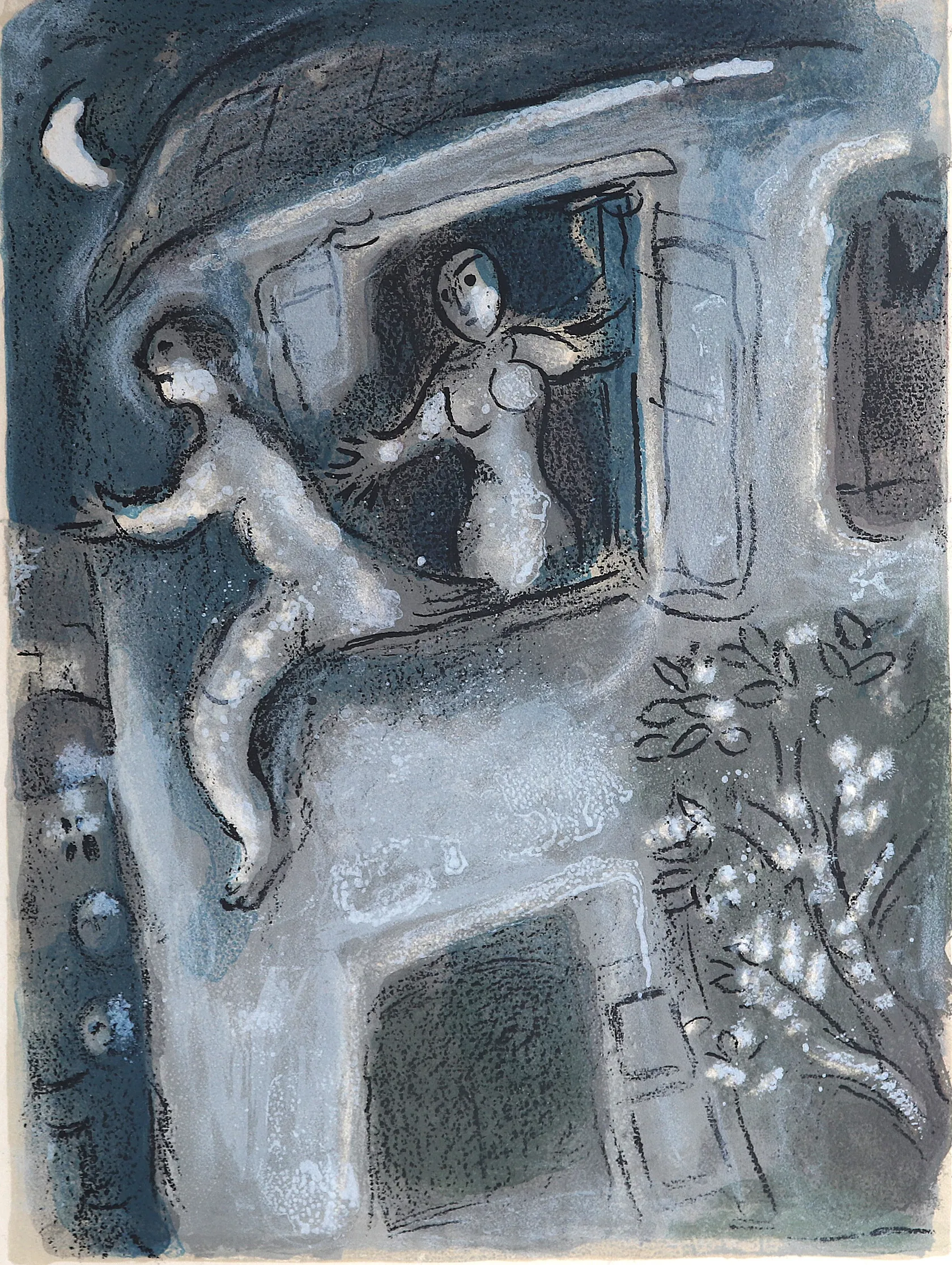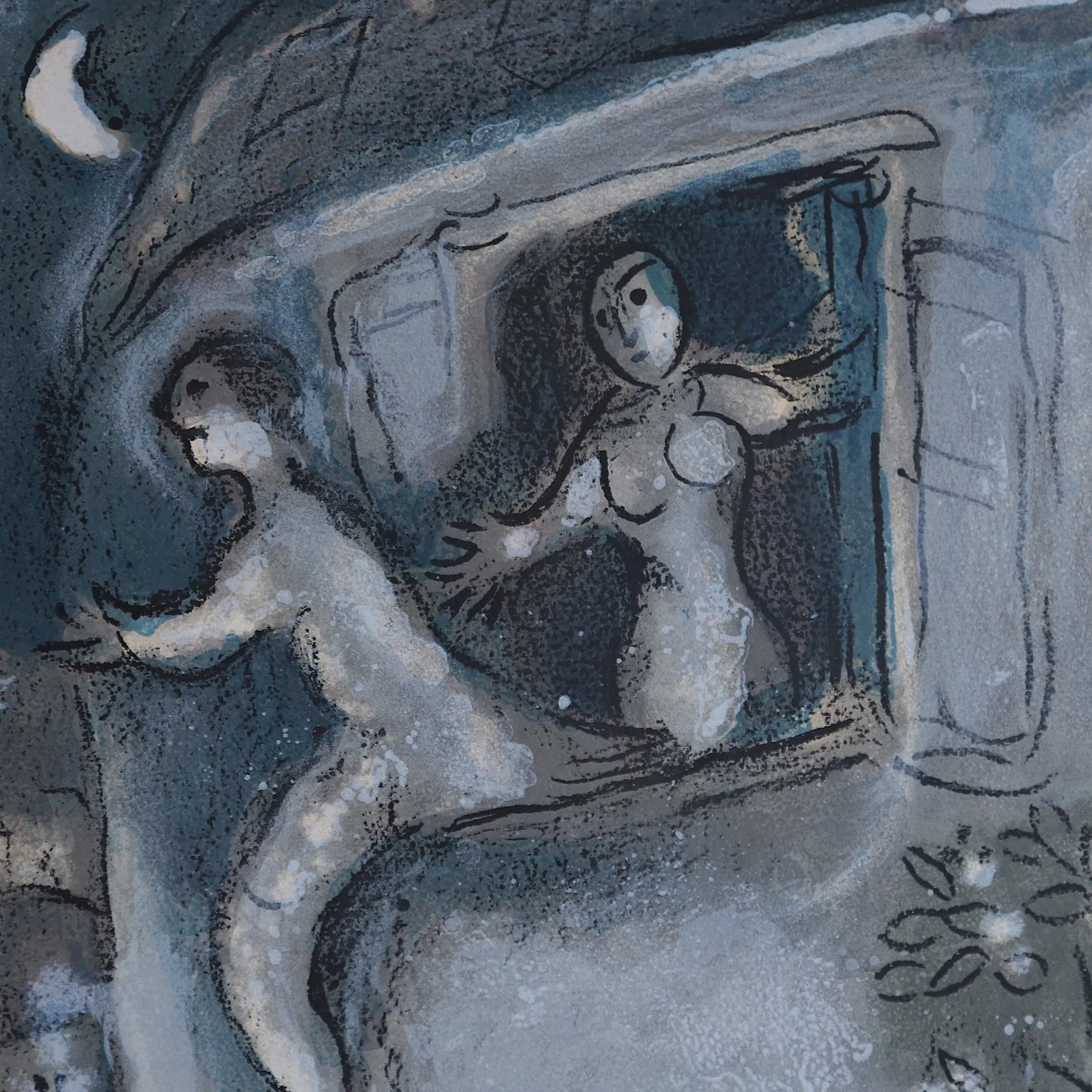 Tavla, litografi, Marc Chagall, "David sauve par Michael" ur Dessins pour la Bible, 1960, signerad och numrerad 14/50, bildyta 35,8 x 26,9 cm, enligt etikett a tergo inköpt 1966 hos Galerie Pierre, Nybrogatan 1, Stockholm, ej examinerad ur ram, mindre gulnad, enstaka mindre fläckar. Skickas med postpaket. Omfattas av BUS-avgift.