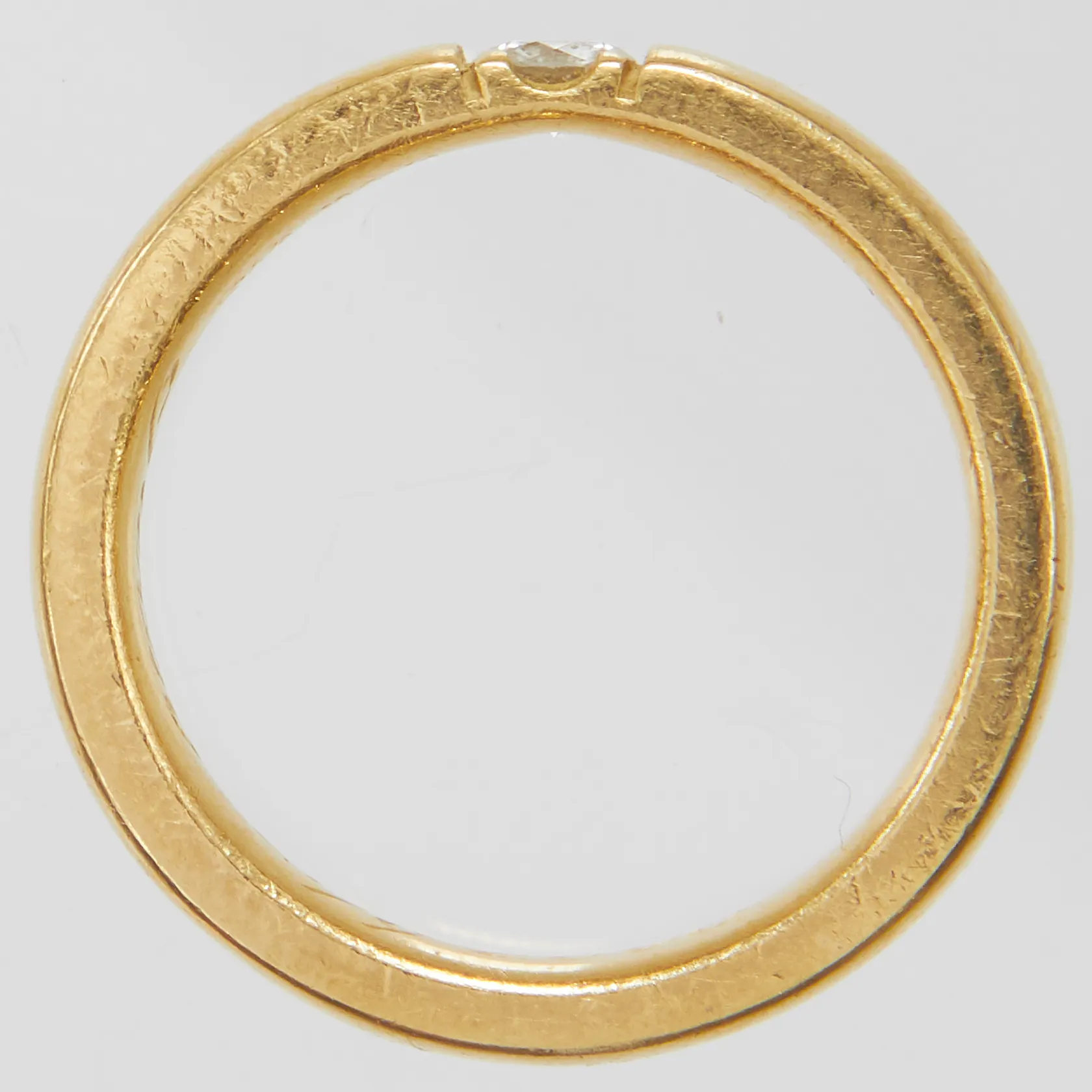 Ring med diamant 1 x ca 0,13ct, stl16¼, bredd 3,5mm, gravyr, 18K Vikt: 5,9 g.