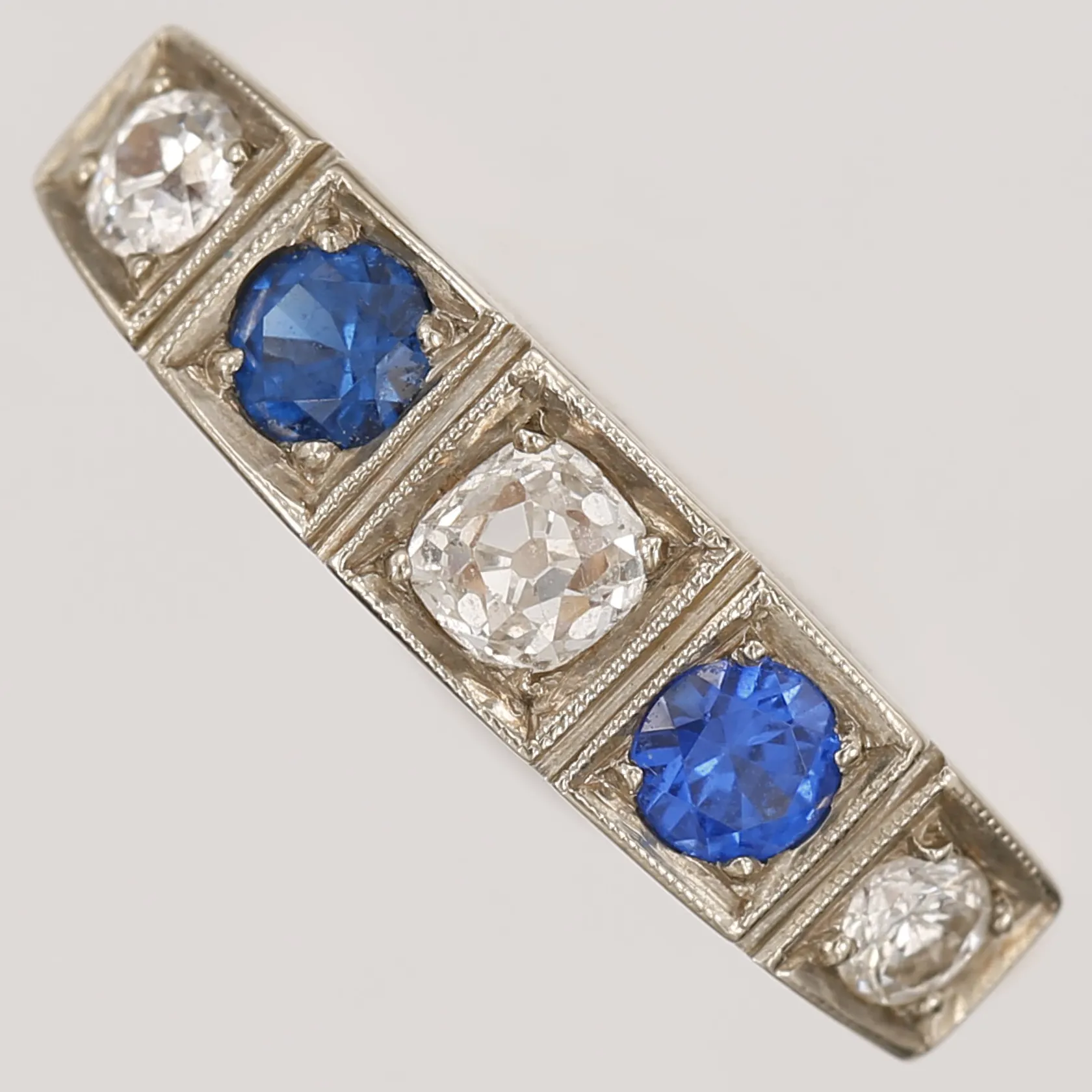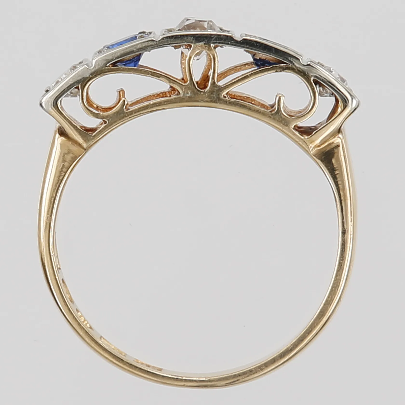 Ring med antik och briljantslipade diamanter totalt ca 0,25ct och blå syntetiska stenar, stl 16¾, 18K guld samt vitguld Vikt: 3,7 g.