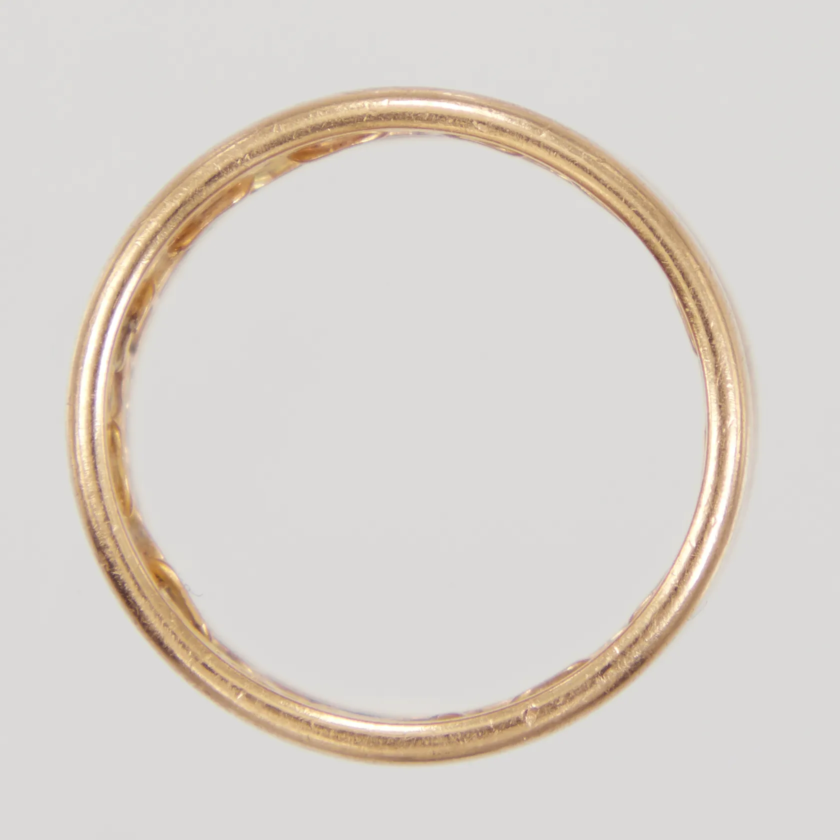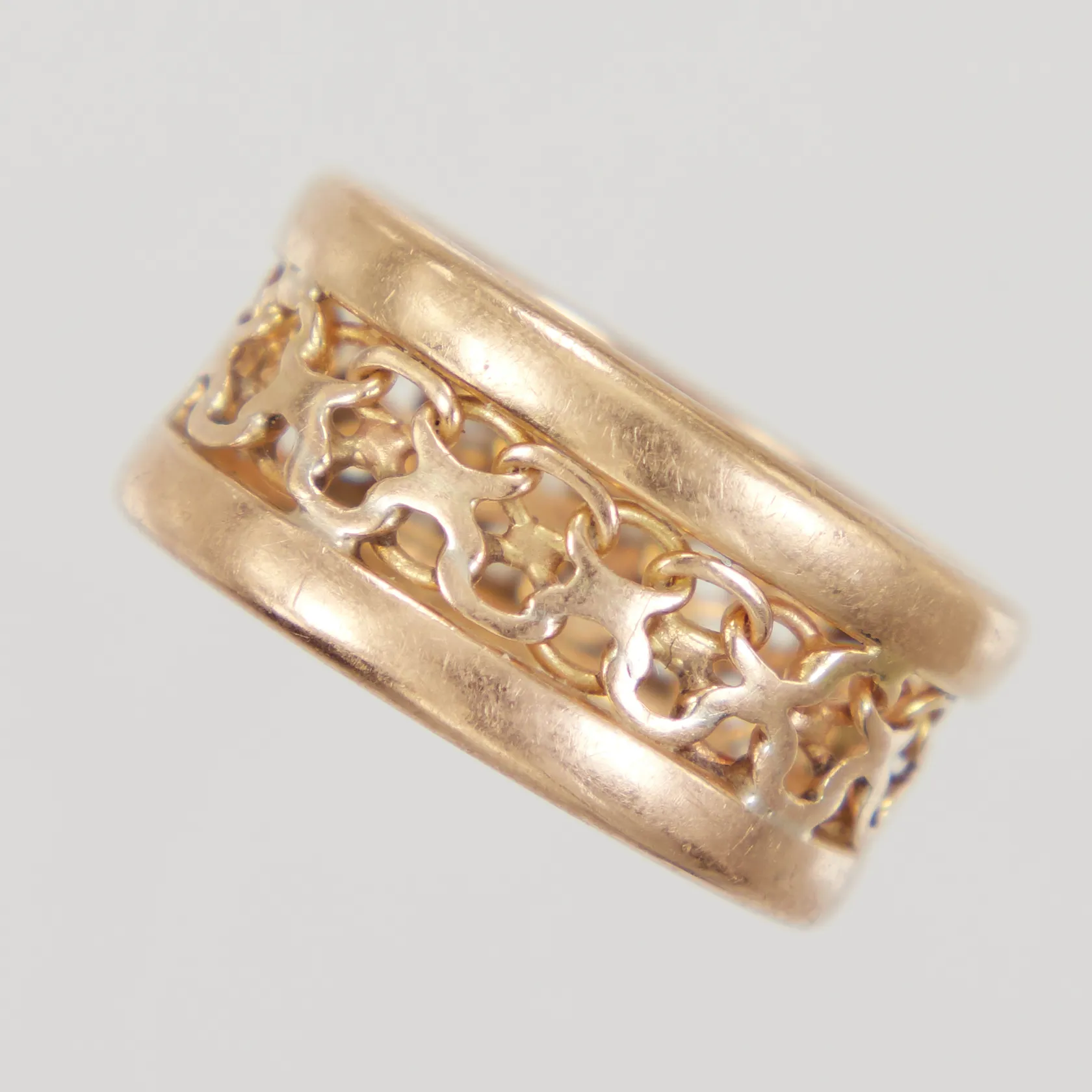 Ring omgjord av 3 olika ringar, stl 17½, bredd ca 10mm, gravyr/slitage, 18K Vikt: 7 g.