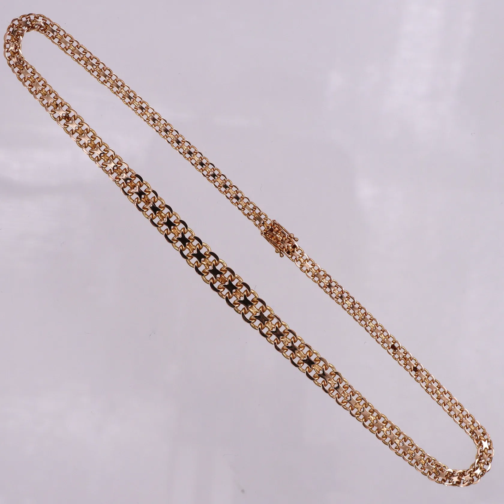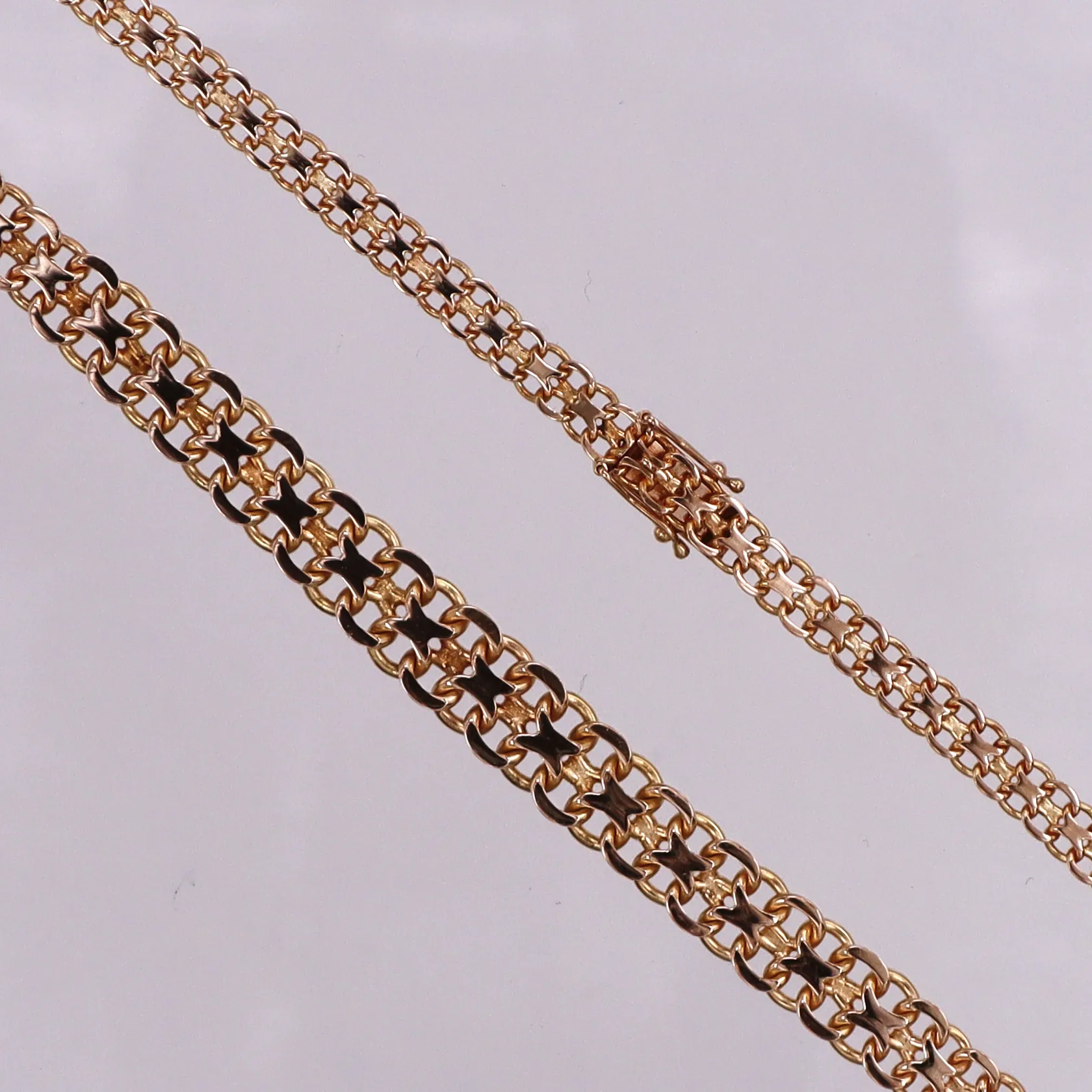 Collier 18k X-länk,Hedens Guldatelje Stockholm 1965,längd ca 42.5 cm,bredd ca 5-8.9 mm. Vikt: 25,5 g.