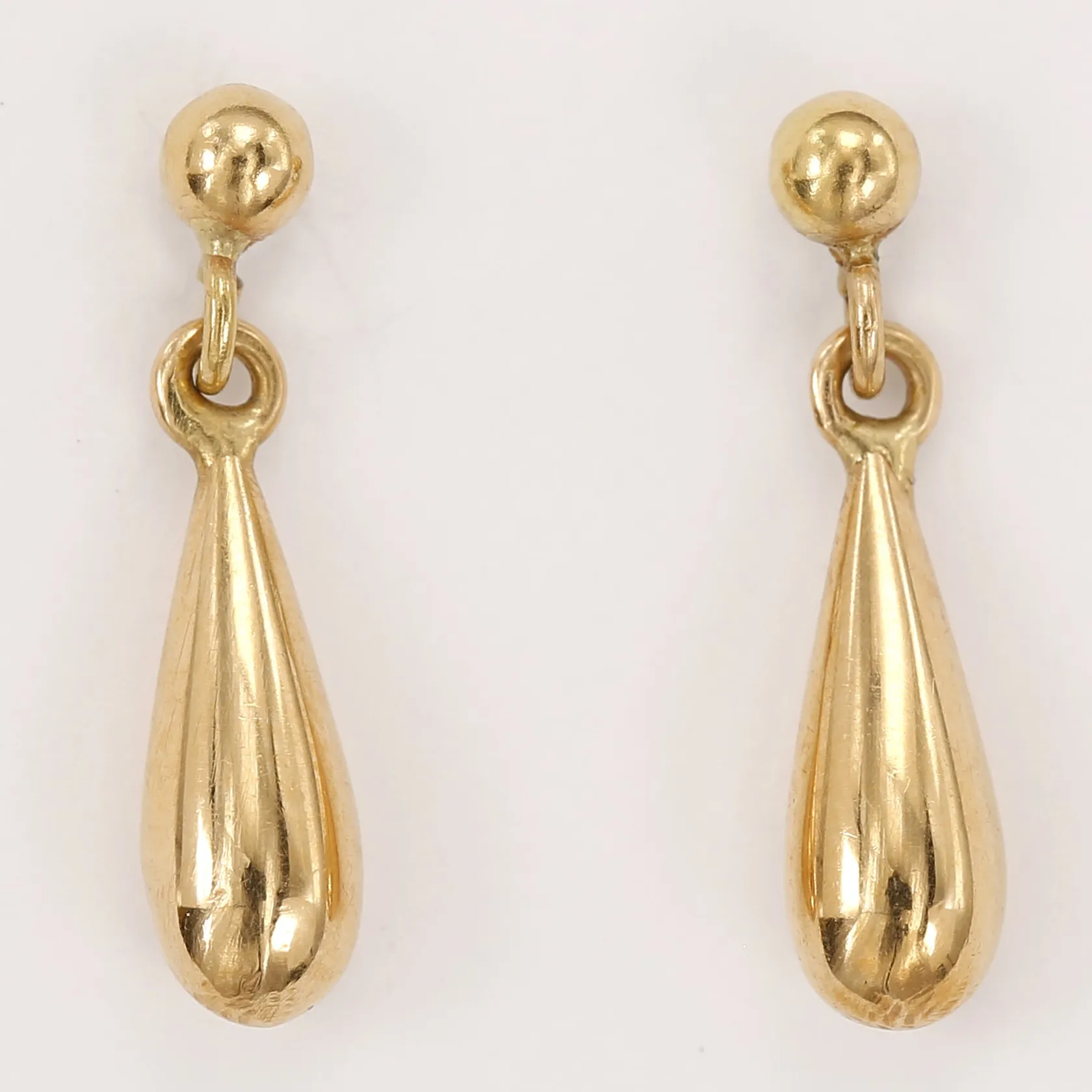 Ett par örhängen, droppformade, höjd: 18 mm, bredd: 4 mm, 18K guld. Vikt: 1,5 g.