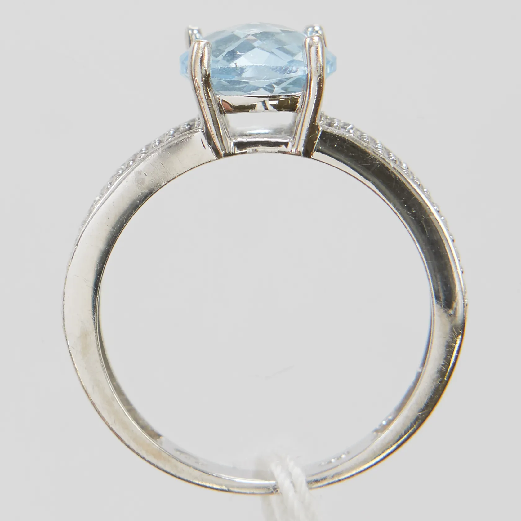 Ring med blå topas samt vita stenar, stl 17, bredd 3-8mm, vitguld, 14K, bruttovikt: 4,0g Vikt: 4 g.