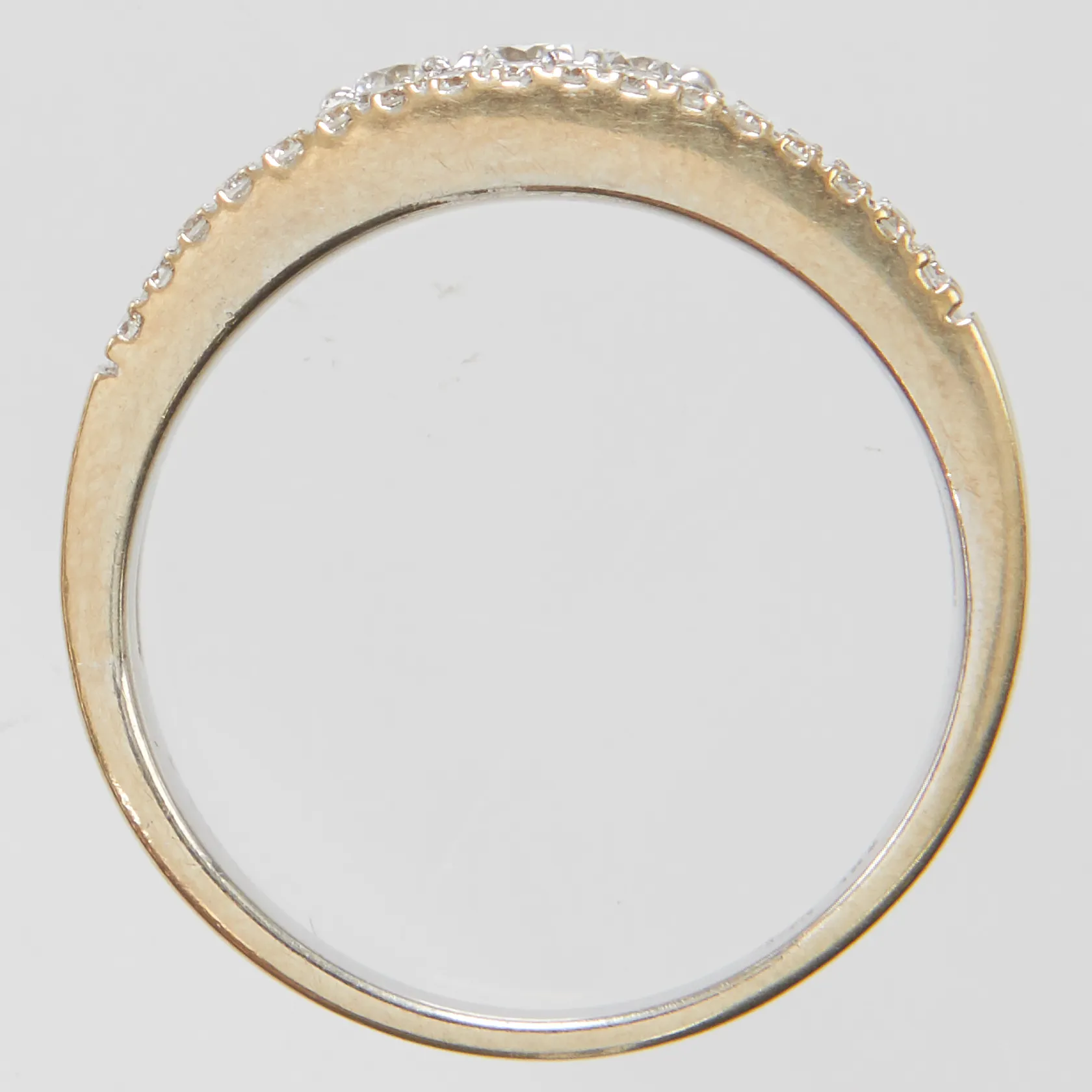 Ring med 20 diamanter 0,25ctv enligt gravyr, stl16, bredd 2,5-4,5mm, vitguld, behov av rodiering, 18K Vikt: 3,4 g.