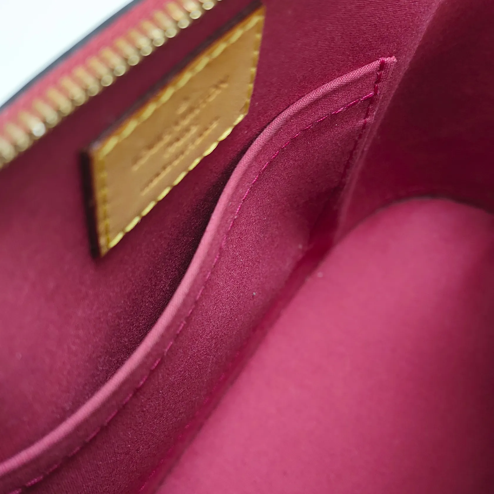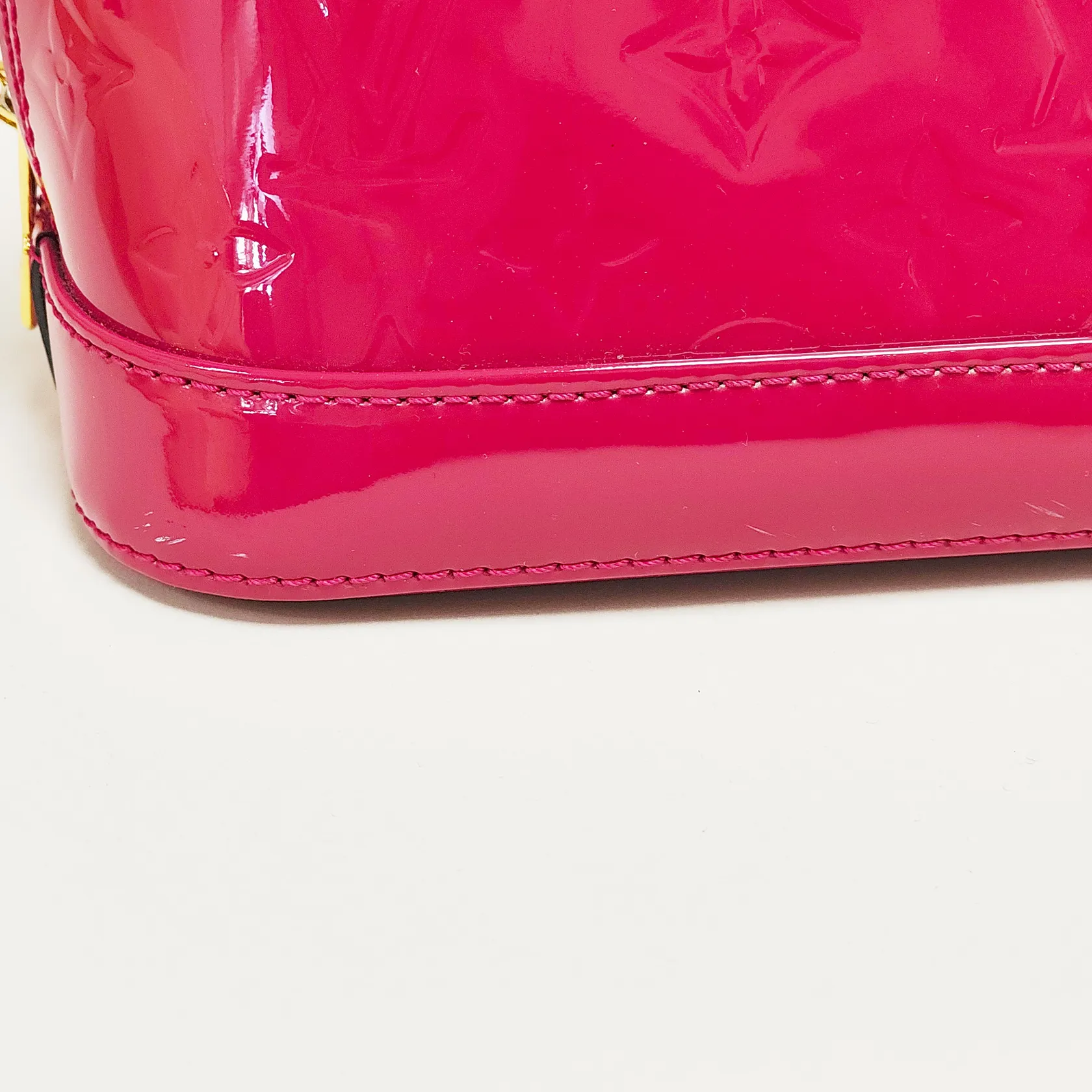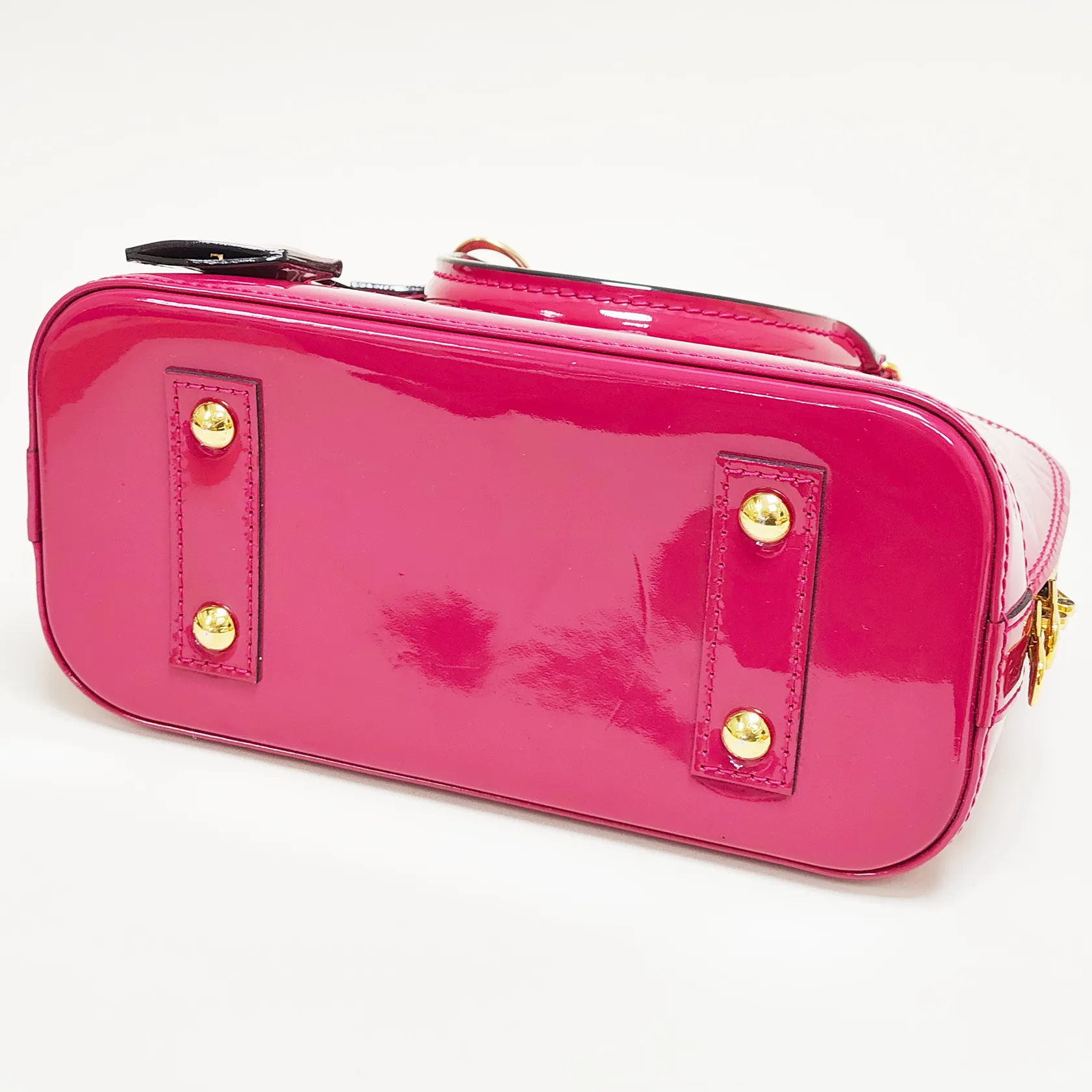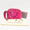 Väska Louis Vuitton Alma BB Monogram Vernis Rose Indien, ref.nr: M91771, 23,5x17,5x11,5cm, datumkod, MI2125, Frankrike 2015, lackläder, textilfoder, beslag i gulmetall, avtagbar axelrem, hänglås samt nycklar, skavmärken på lackläder, kvitto från Louis Vuitton Birger Jarlsgatan 2015 samt dustbag medföljer
