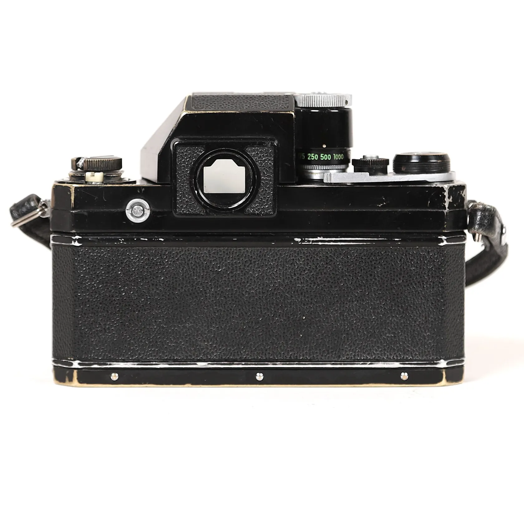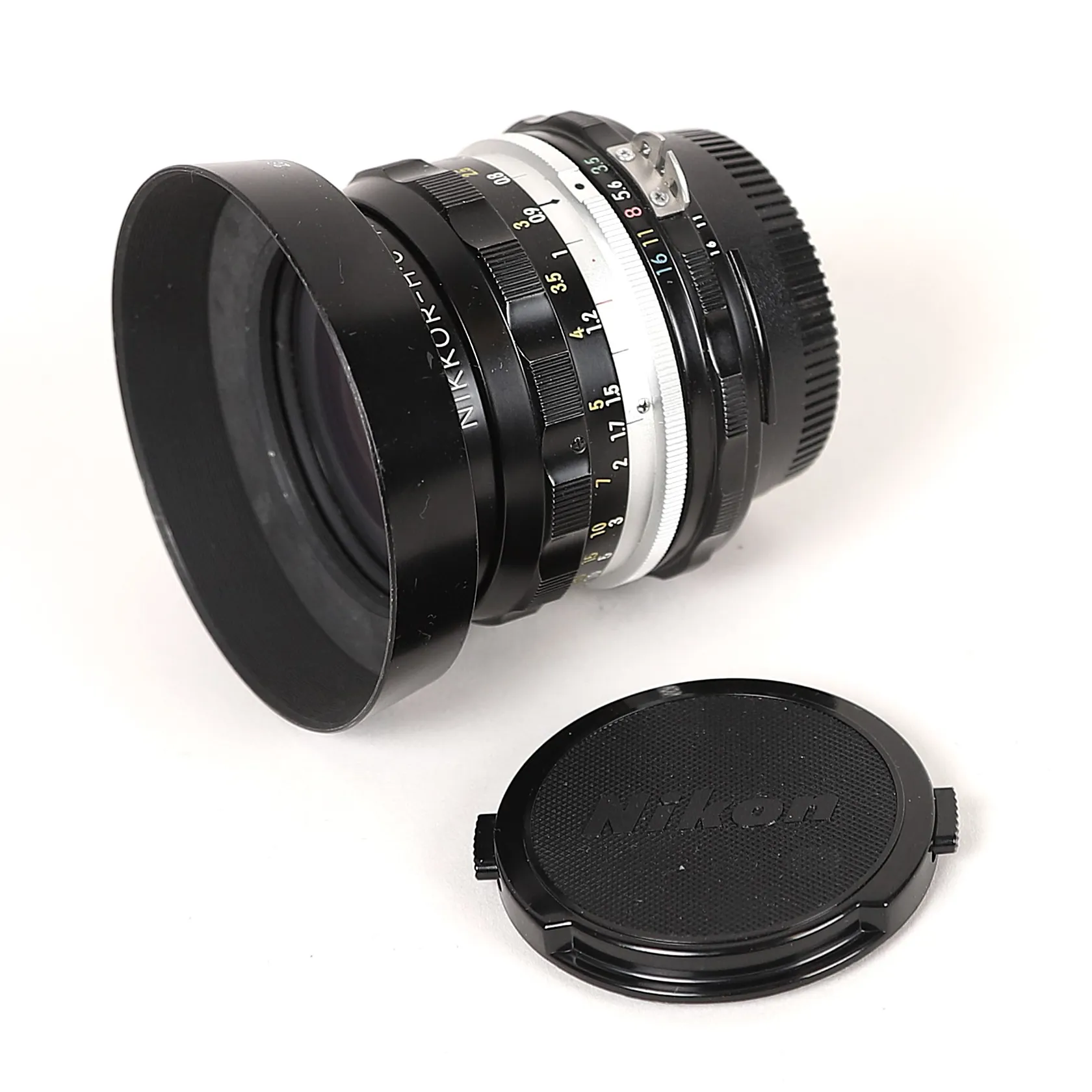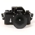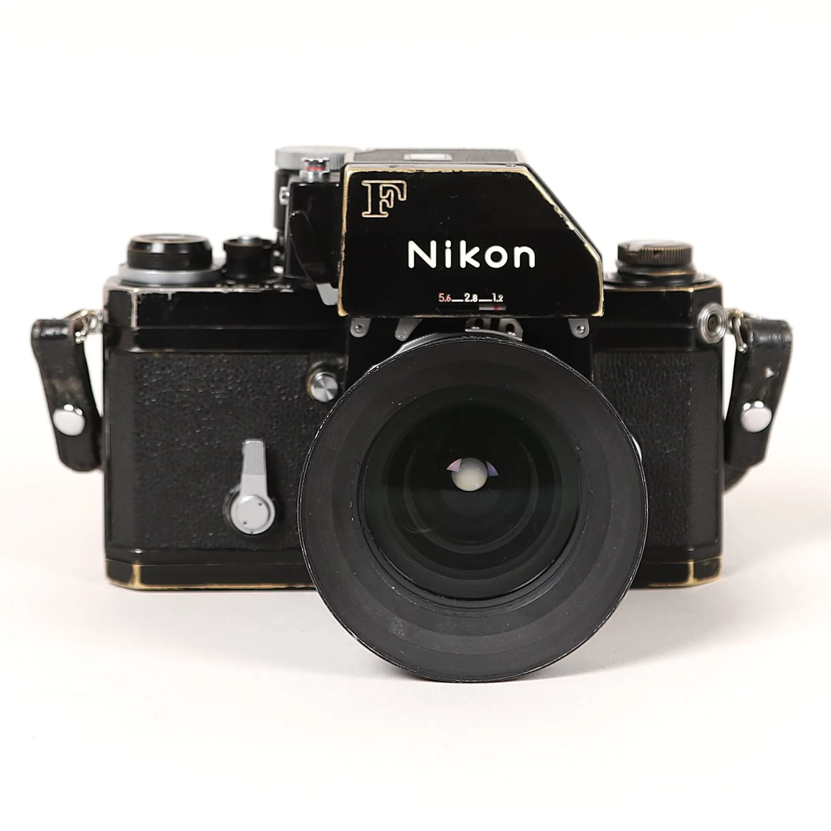 Kamera, Nikon F, med Photomic, svart, serienummer 7061071, Japan, 1960-tal, med objektiv Nikkor -hc 1:3.5/28, linsskydd fram och bak, motljusskydd, bruksslitage, seg i långa tider, ej funktionstestad