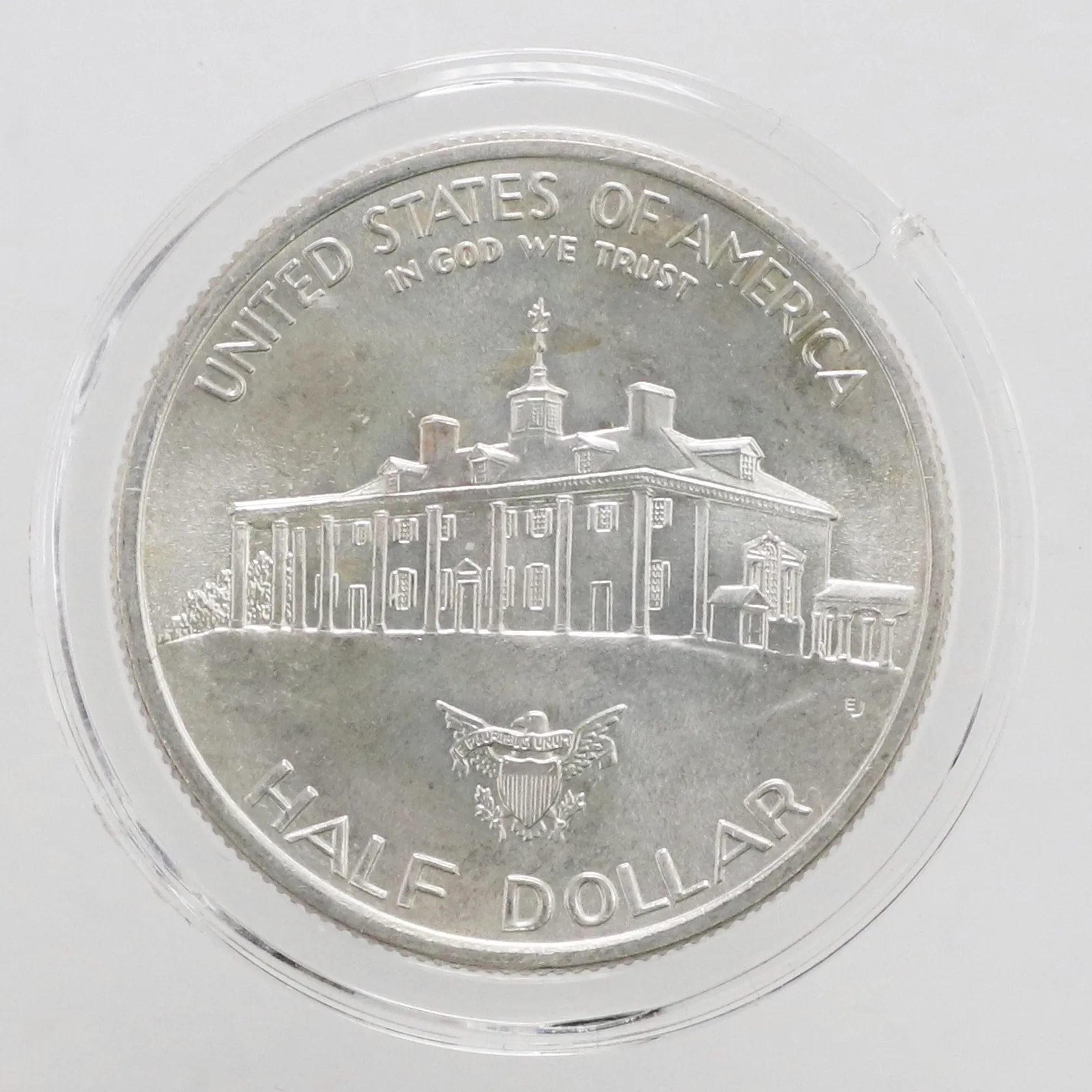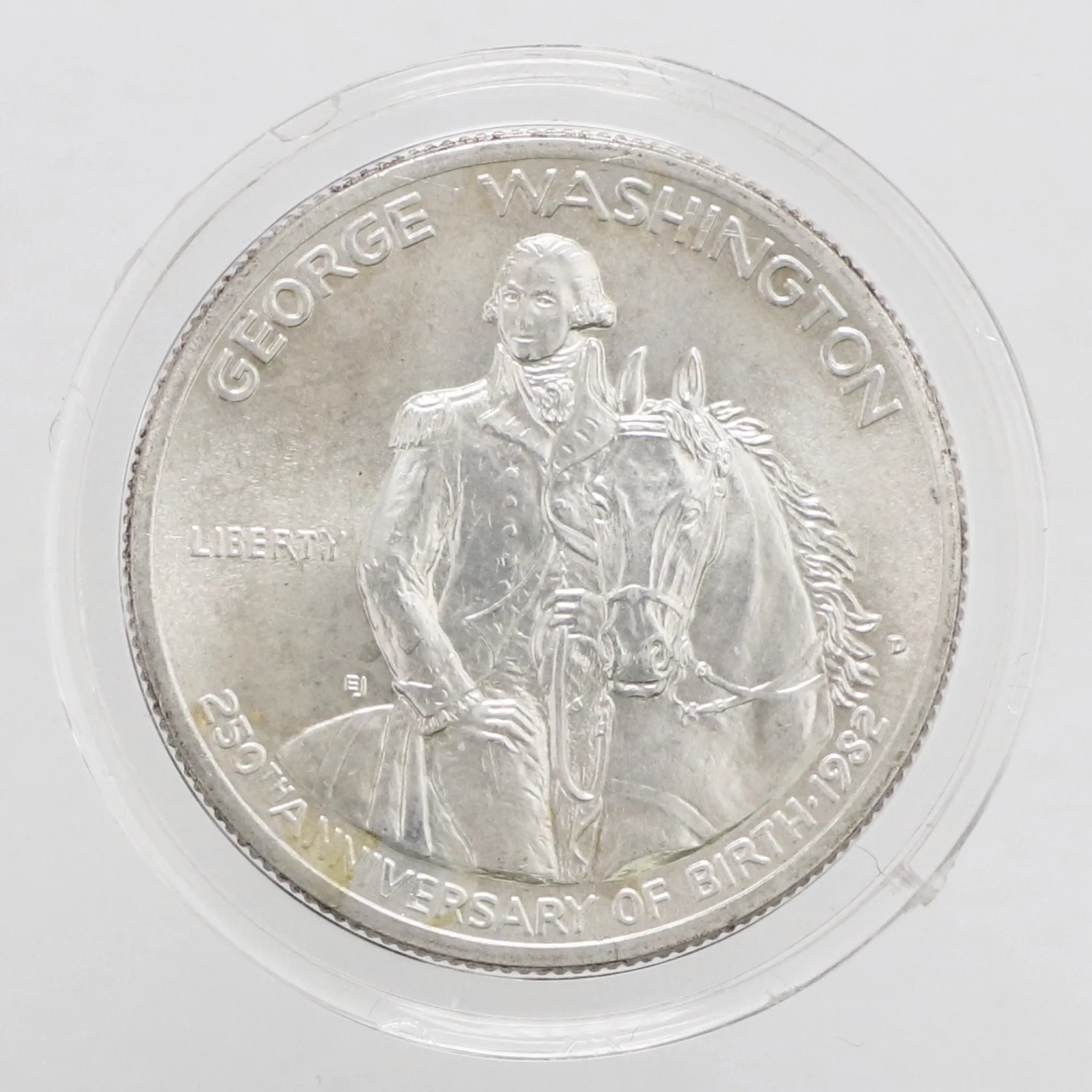 Mynt George Washington 250th Anniversary år 1982 United states of America half dollar, Ø30mm, några missfärgade fläckar, plastetui, 900/1000 silver Vikt: 12,5 g.
