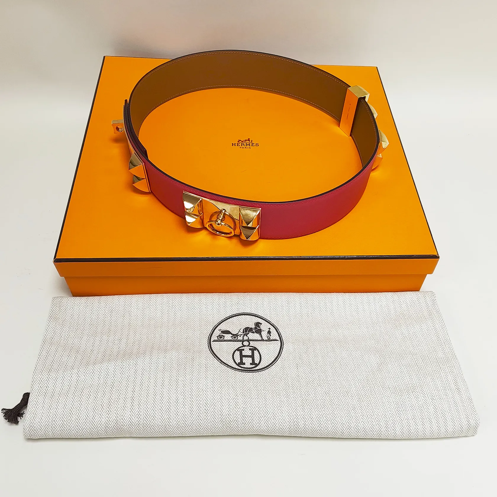 Bälte Hermès Collier de Chien 50, färg: Rose Extrême, roséguldpläterad metalldekor, längd: 85,5cm, kvitto från NK 28/06/2023, dustbag samt box