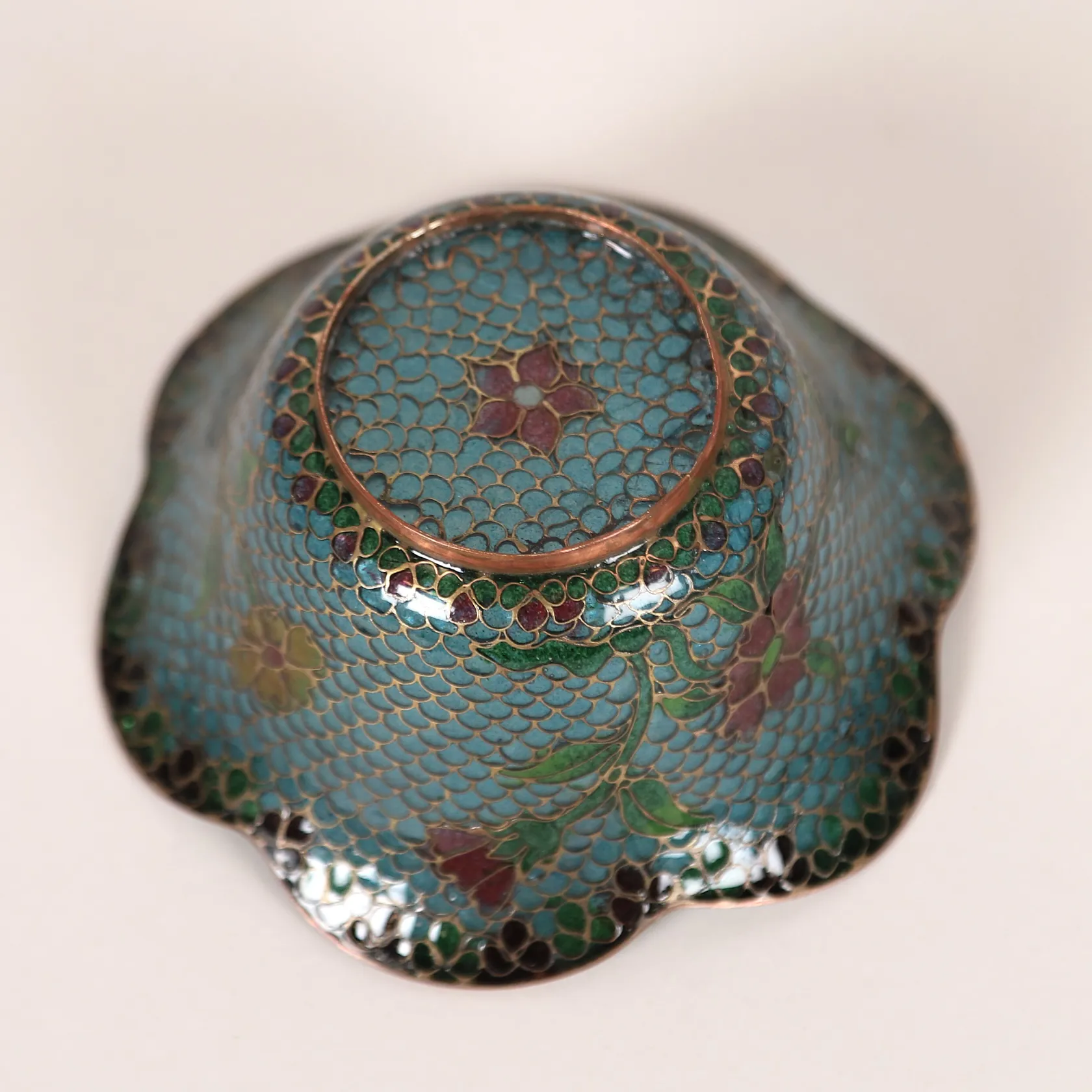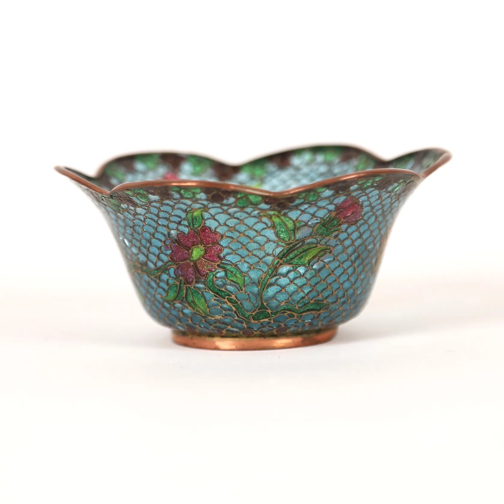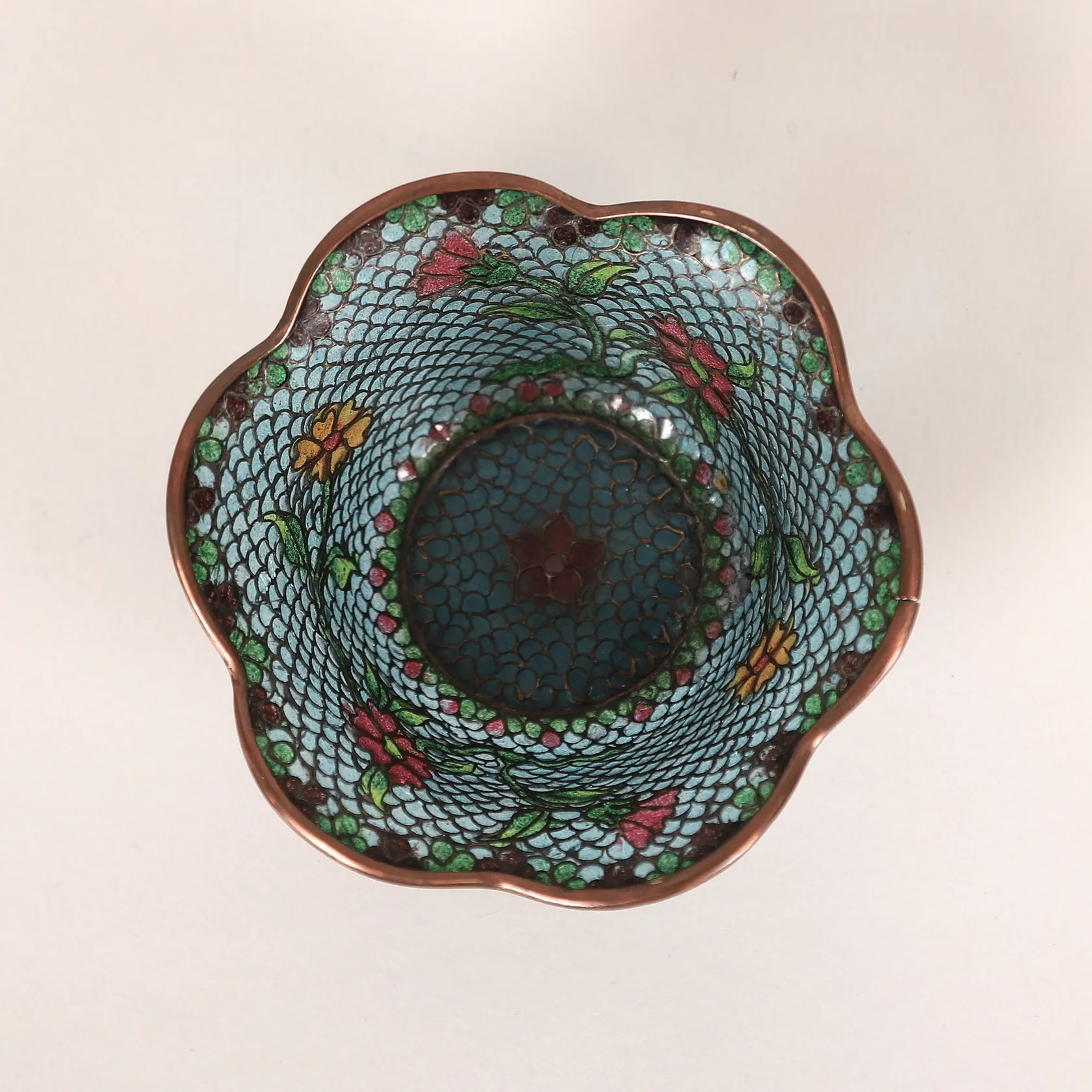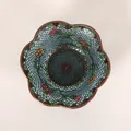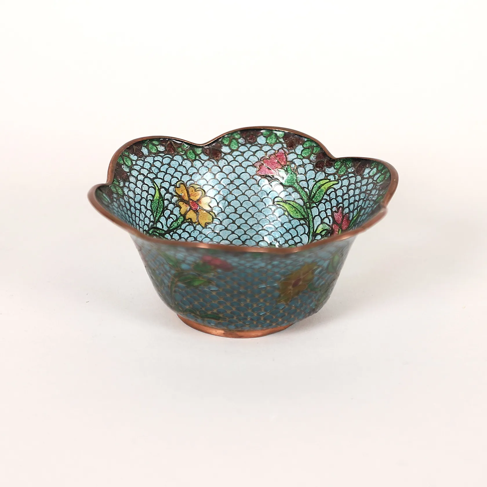 Skål, glas och mässingstråd, polykrom blomsterdekor, tidigt 1900-tal, Ø ca 10 cm, höjd: 4,5 cm, åldersbetingat slitage, smärre defekter.