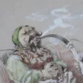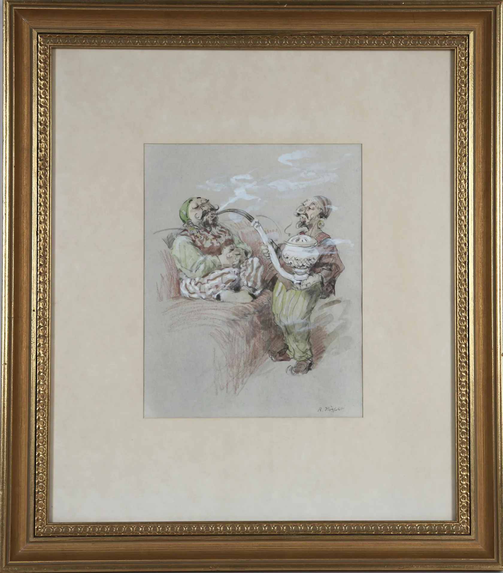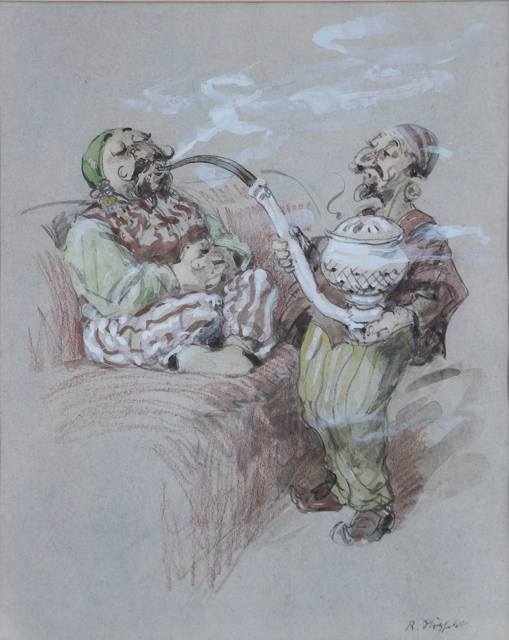 Tavla Robert Högfeldt, blandteknik på papper, motiv av två män med vattenpipa, Signerad R. Högfeldt, dagmått 25x20cm, ej examinerad, mindre gulnat blad. Skickas med postpaket. Omfattas av BUS-avgift.