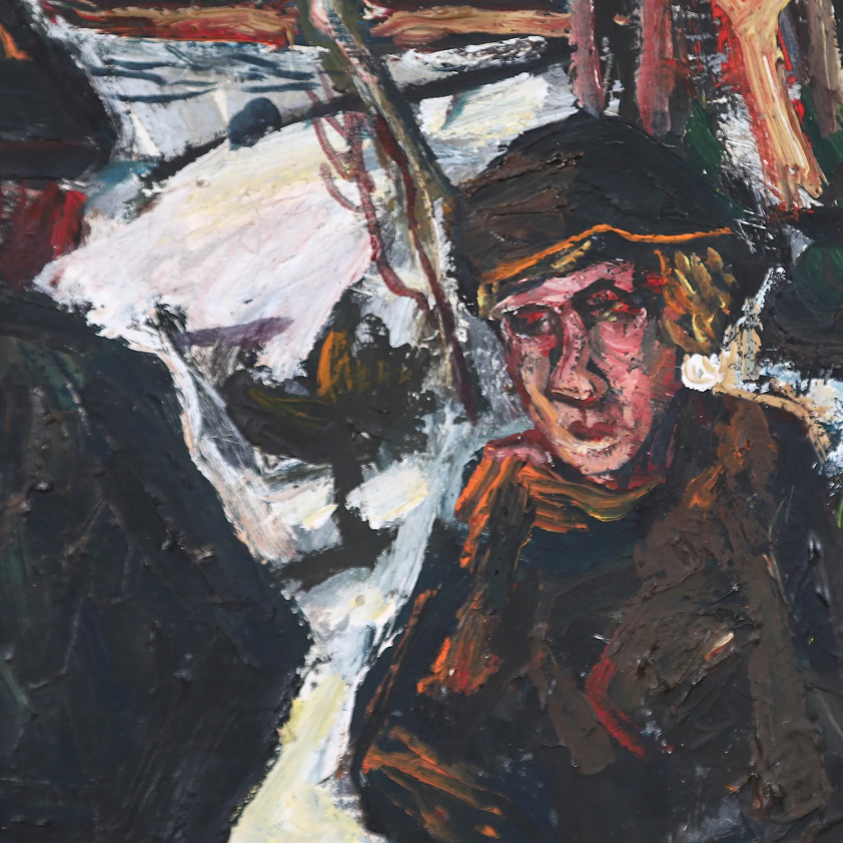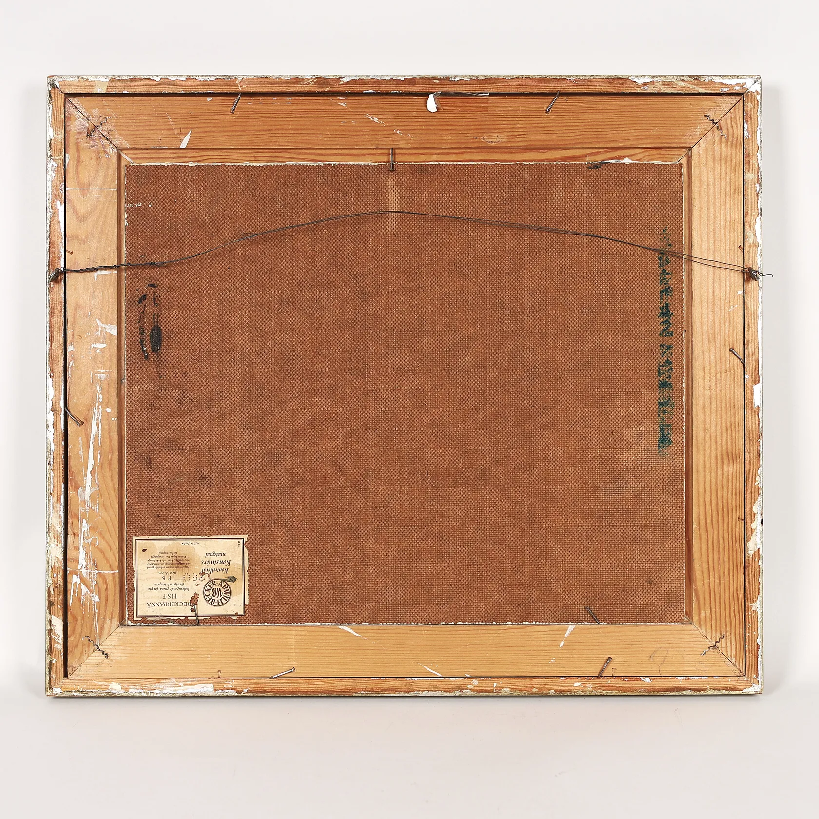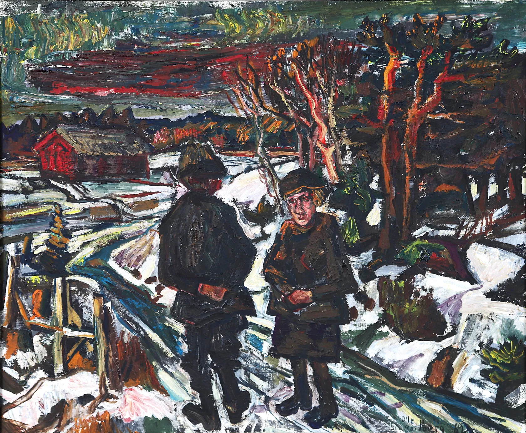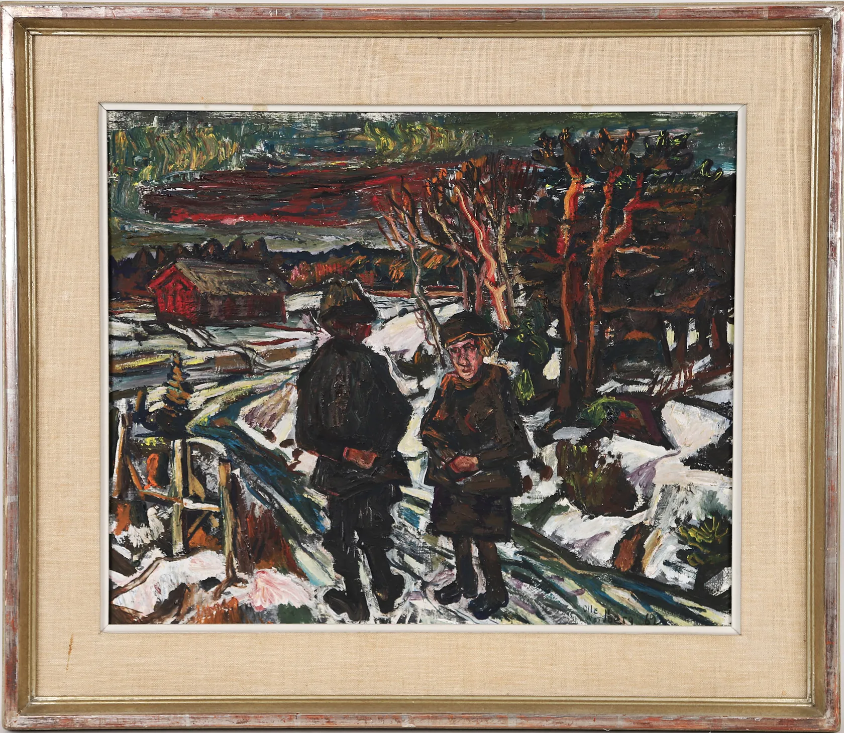 Tavla Olle Nordberg, olja på pannå, signerad och daterad 69, motiv av man och kvinna i vinterlandskap, 38x46cm, ram gulnad samt med fläck. Skickas med postpaket. Omfattas av BUS-avgift.