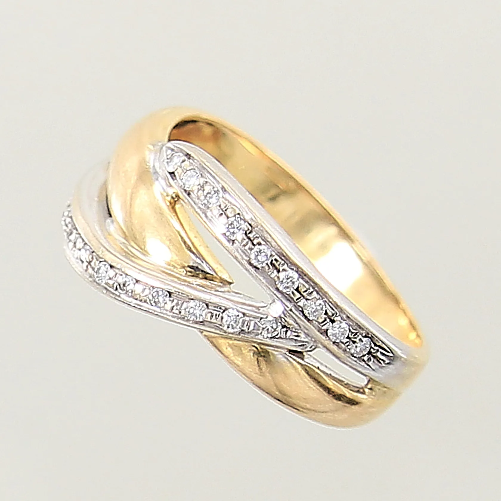 Ring med diamanter 20 x ca 0,01ct, stl 17¾, bredd 4-10mm, vitguldsdetaljer, 18K Vikt: 5 g.