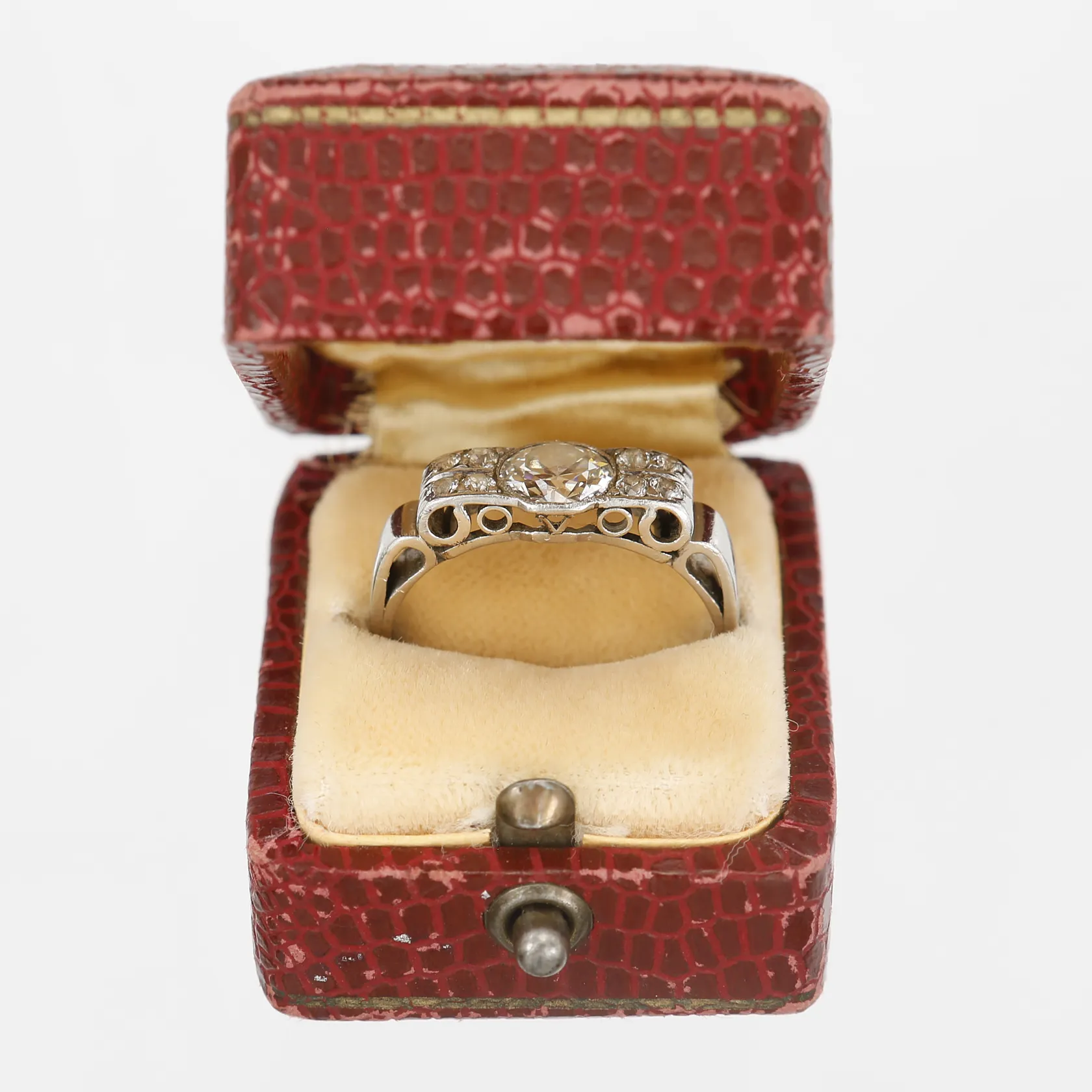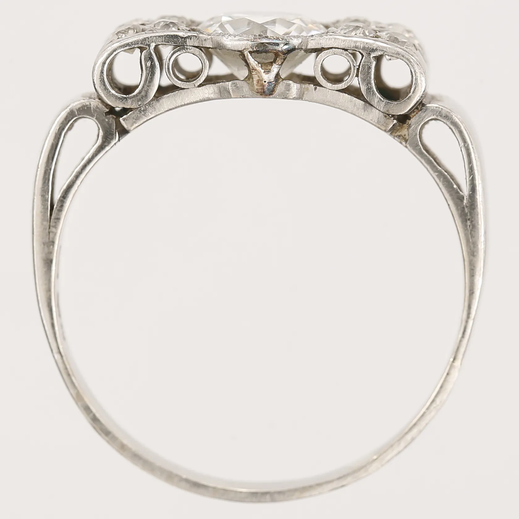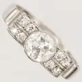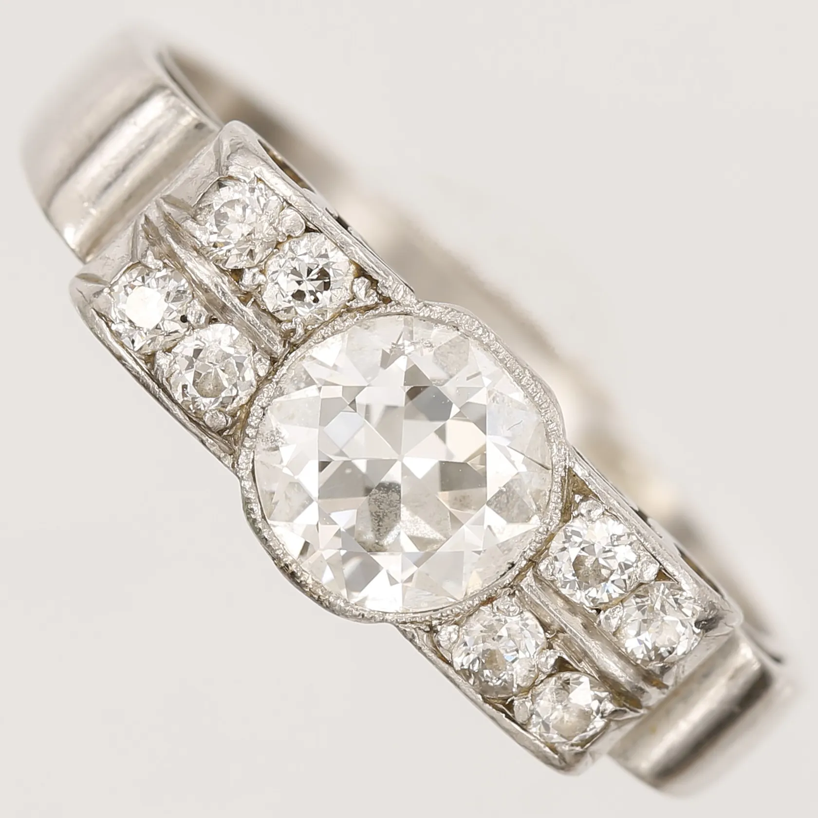 Ring med gammalslipade diamanter, 1 x ca 1,50ct, TW - W (G-H)/SI1 , 8 x ca 0,05ct, stl 21¼, bredd 2-8mm, originalask, tillverkad av Hugo Strömdahl, något repig skena med spår av lagning/storleksändring, Platina Vikt: 7,6 g.