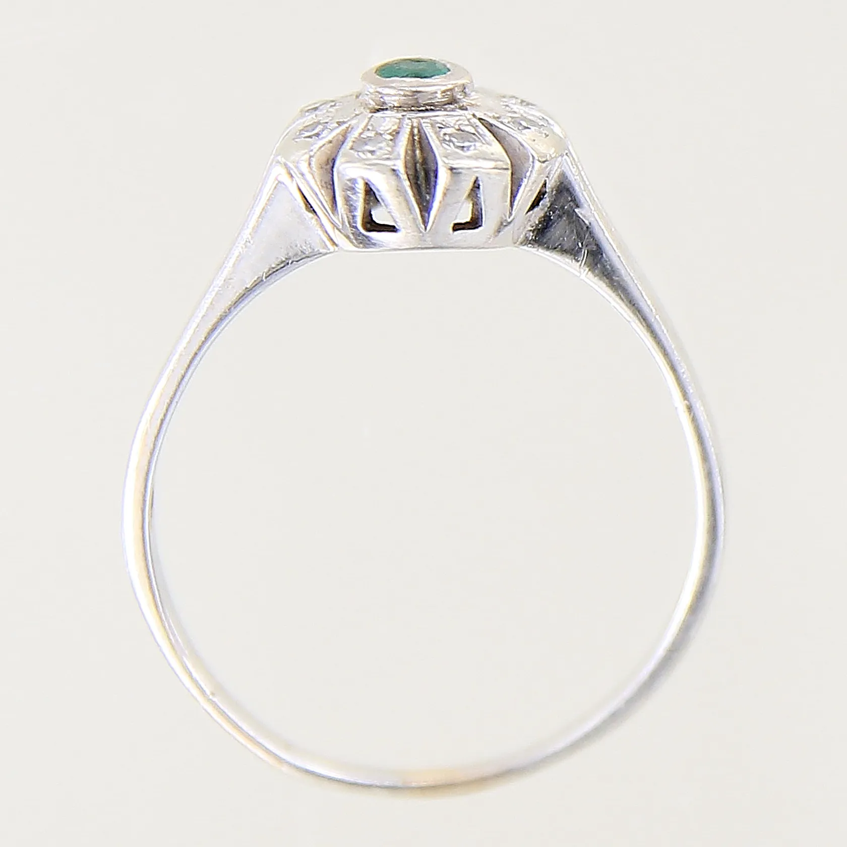 Ring med smaragd samt diamanter 8 x ca 0,01ct, stl 18, bredd 1-9mm, vitguld, spår av storleksändring, i behov av omrodiering, smaragd med slitage samt flertal nagg vid fasetter, 18K Vikt: 3,4 g.