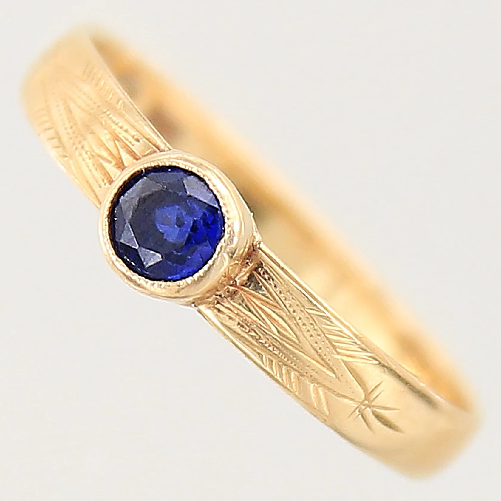 Ring med blå sten, stl: 18, bredd: 3-4,6mm, 18K Vikt: 1,9 g.