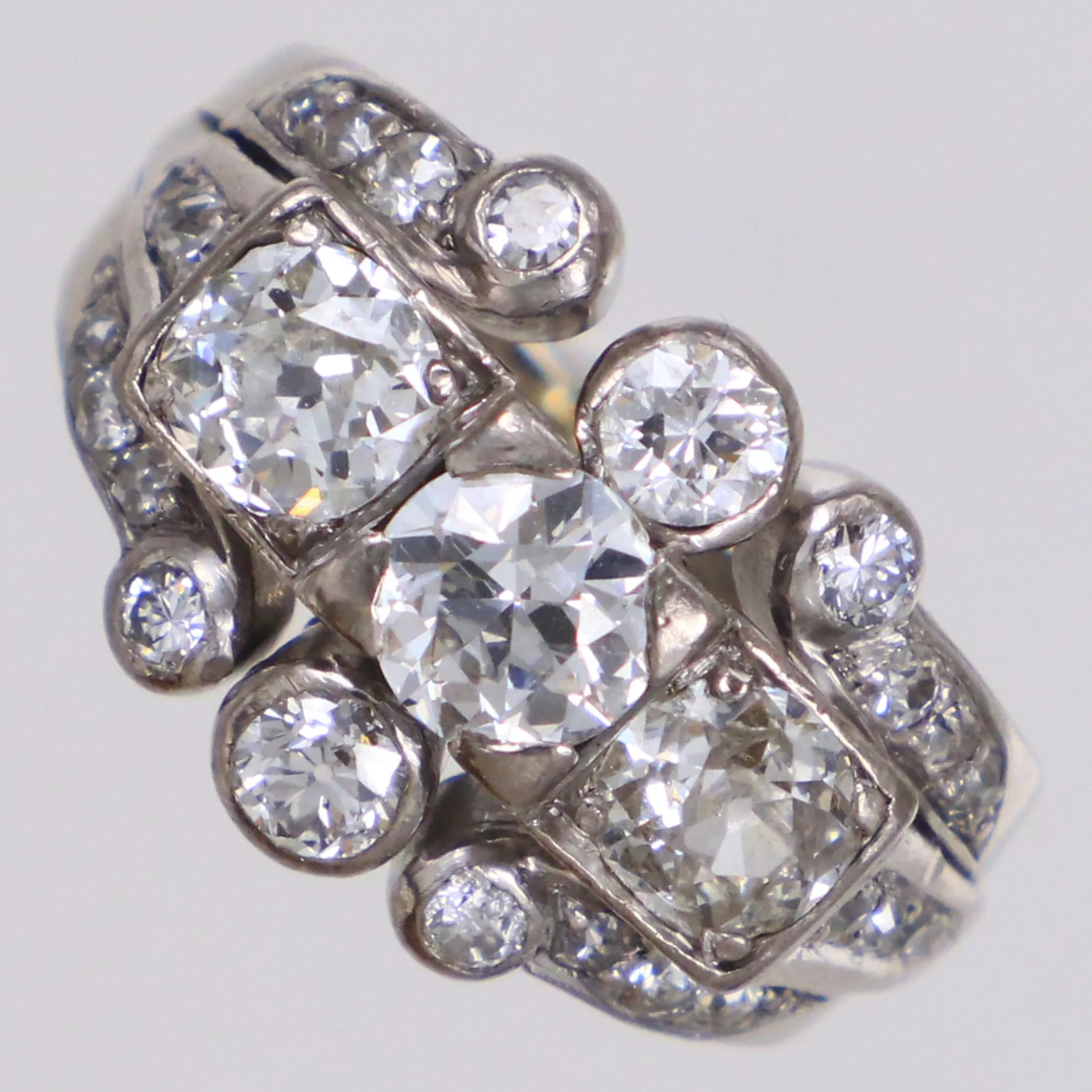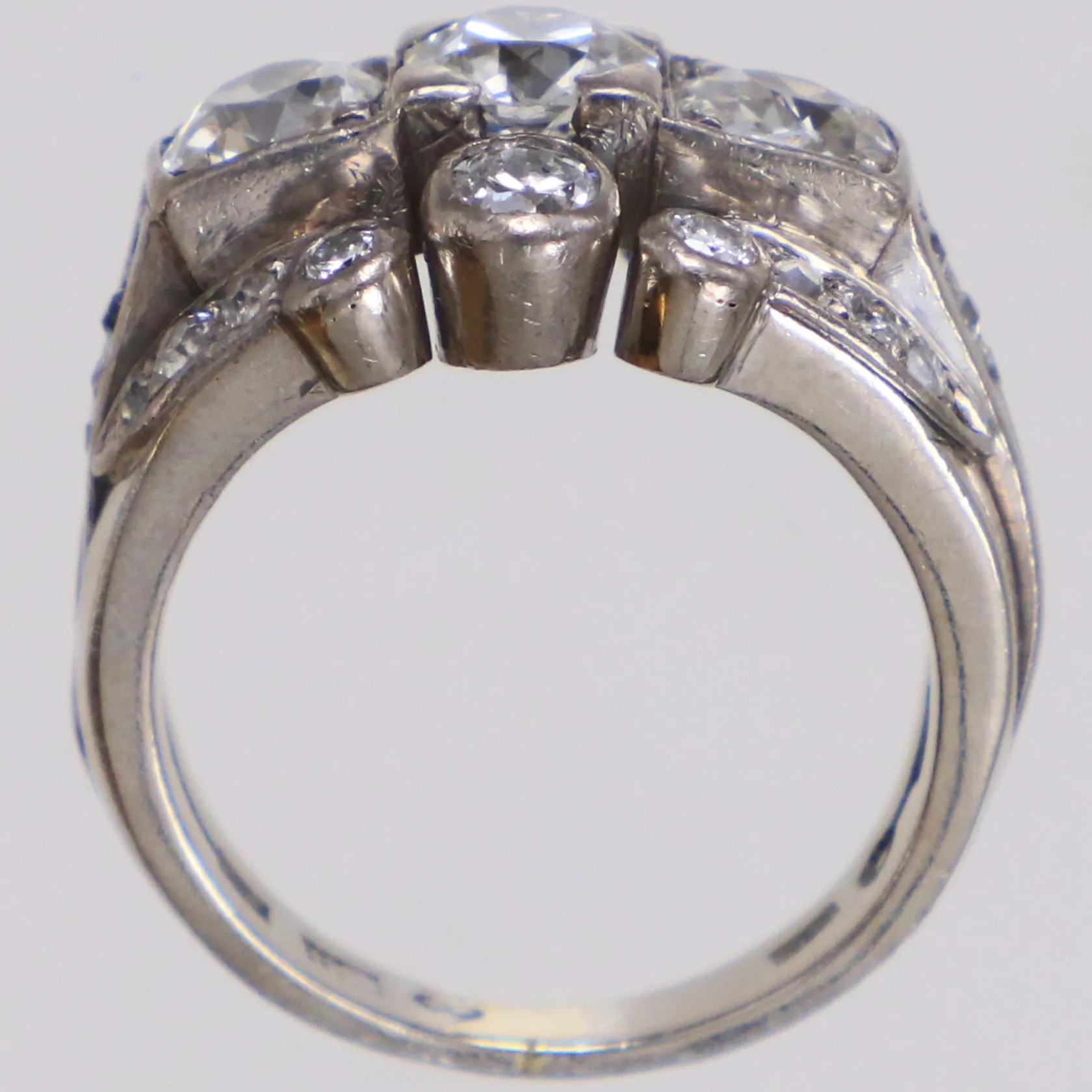 Ring med gammalslipade diamanter 1xca0,66ct 2xca0,55ct 2xca0,12ct, 4xca0,02ct, åttkantslipade 20xca0,01-0,02ct, ca W(H-I)/SI-P, stl:17, bredd 2,9-13,5mm, Hans Strömdahl AB, Stockholm, spår av storleksändring, nagg i gördel på mittsten samt på några av de mindre stenarna, vitguld, 18K Vikt: 12,4 g.