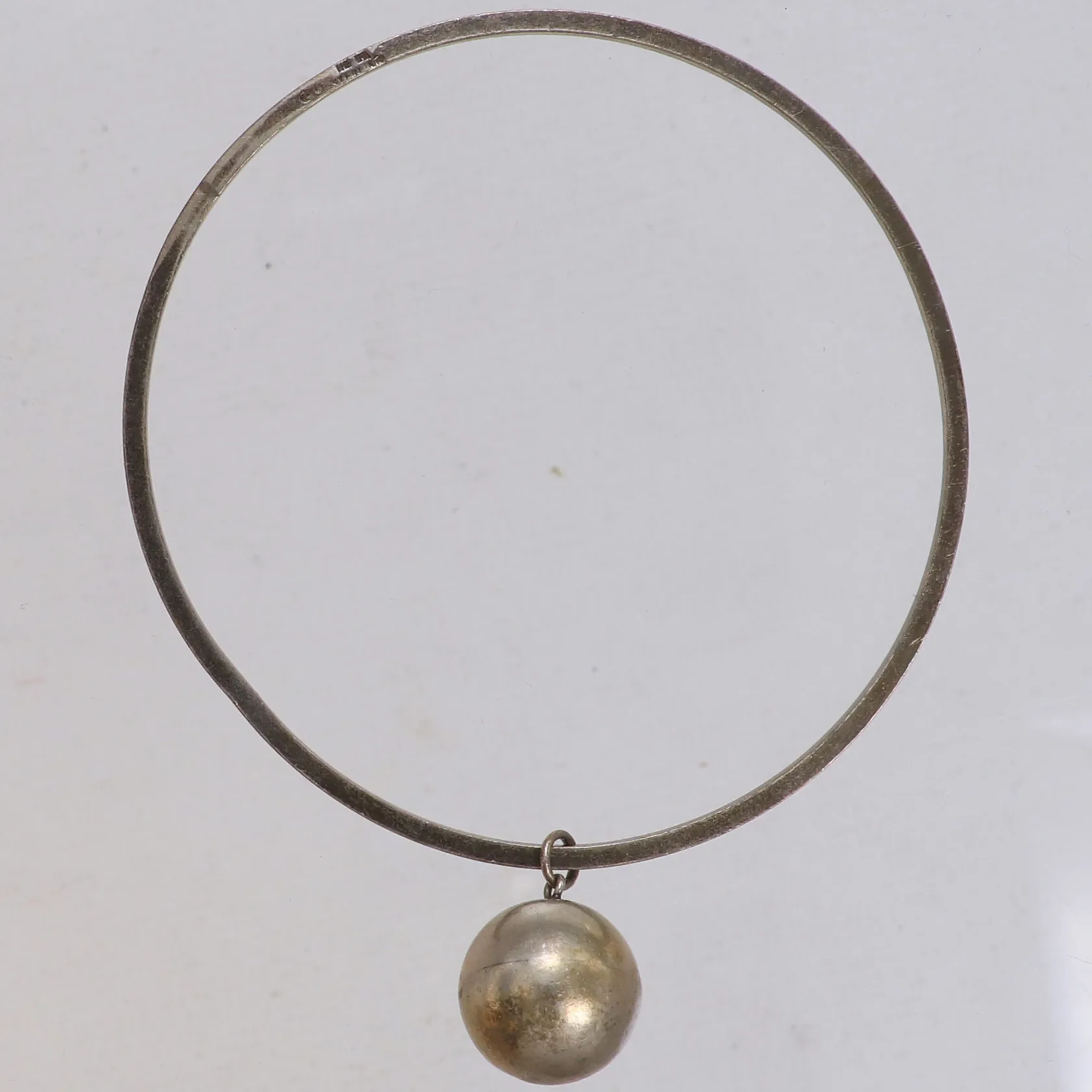 Armring med kula innerdiameter Ø67,5mm, bredd 2mm, hängets mått 22x15,7mm, små bucklor på hänget, silver 925/1000 Vikt: 11,3 g.