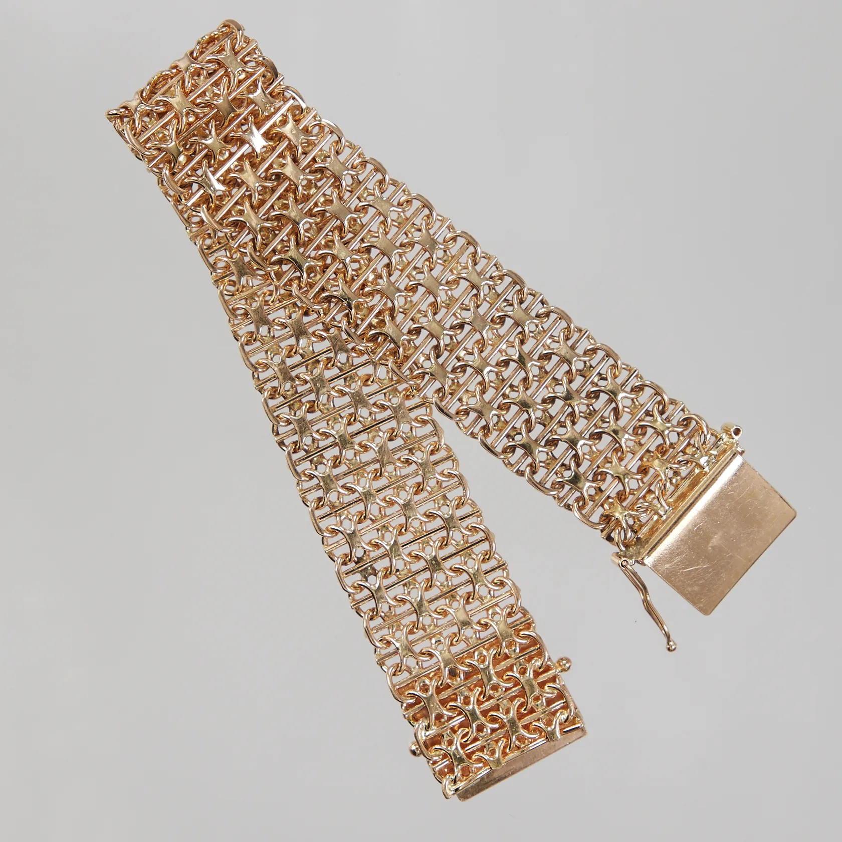 Armband X-länk med stav 18,5cm, bredd 20mm, ena låsåtta saknas, GFAB, 18K Vikt: 52,6 g.