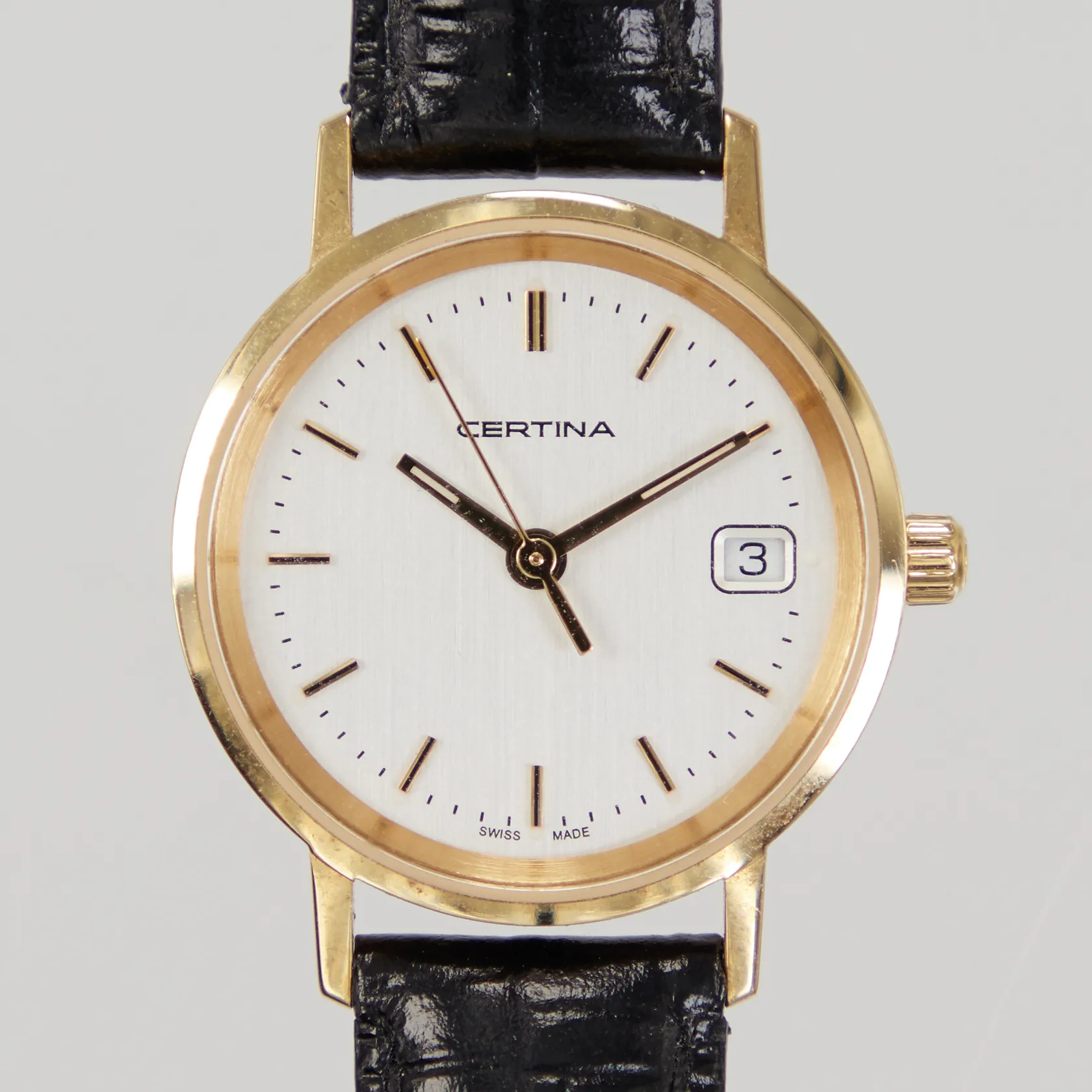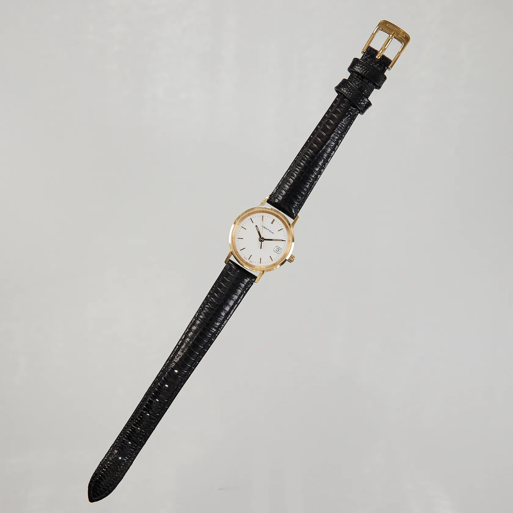 Armbandsu Certina 18K, Ø24mm, kvarts, ref: 152.9289.68, serienr 15TR0002167, datum, läderarmband, gravyr, går ej, behov av batteribyte, inga tillbehör, Bruttovikt:17,1g.