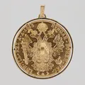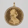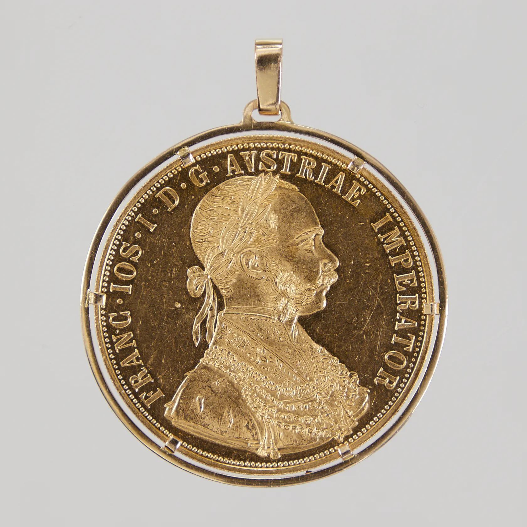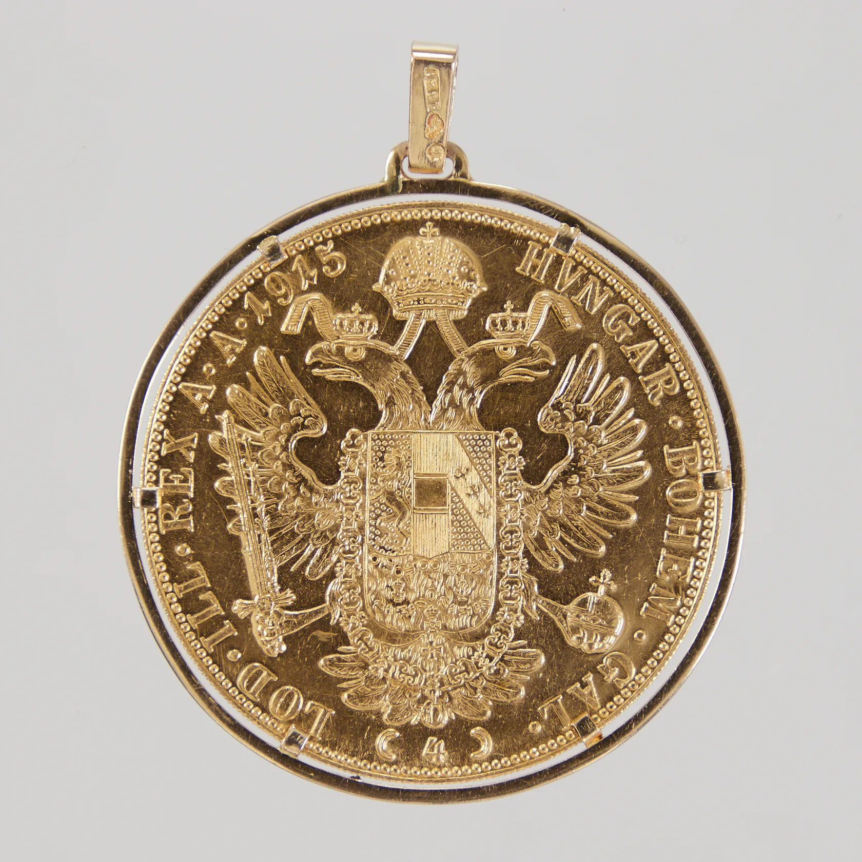 Mynt 4 Dukat 1915, Ø39,5mm, 23K, med ram i 18K Vikt: 17,4 g.