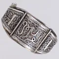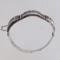 Stelt armband innermått 63,5x54,5mm, bredd 9,7-36,3mm, öppningsbart, säkerhetskedja, ostämplat silver Vikt: 44,8 g.