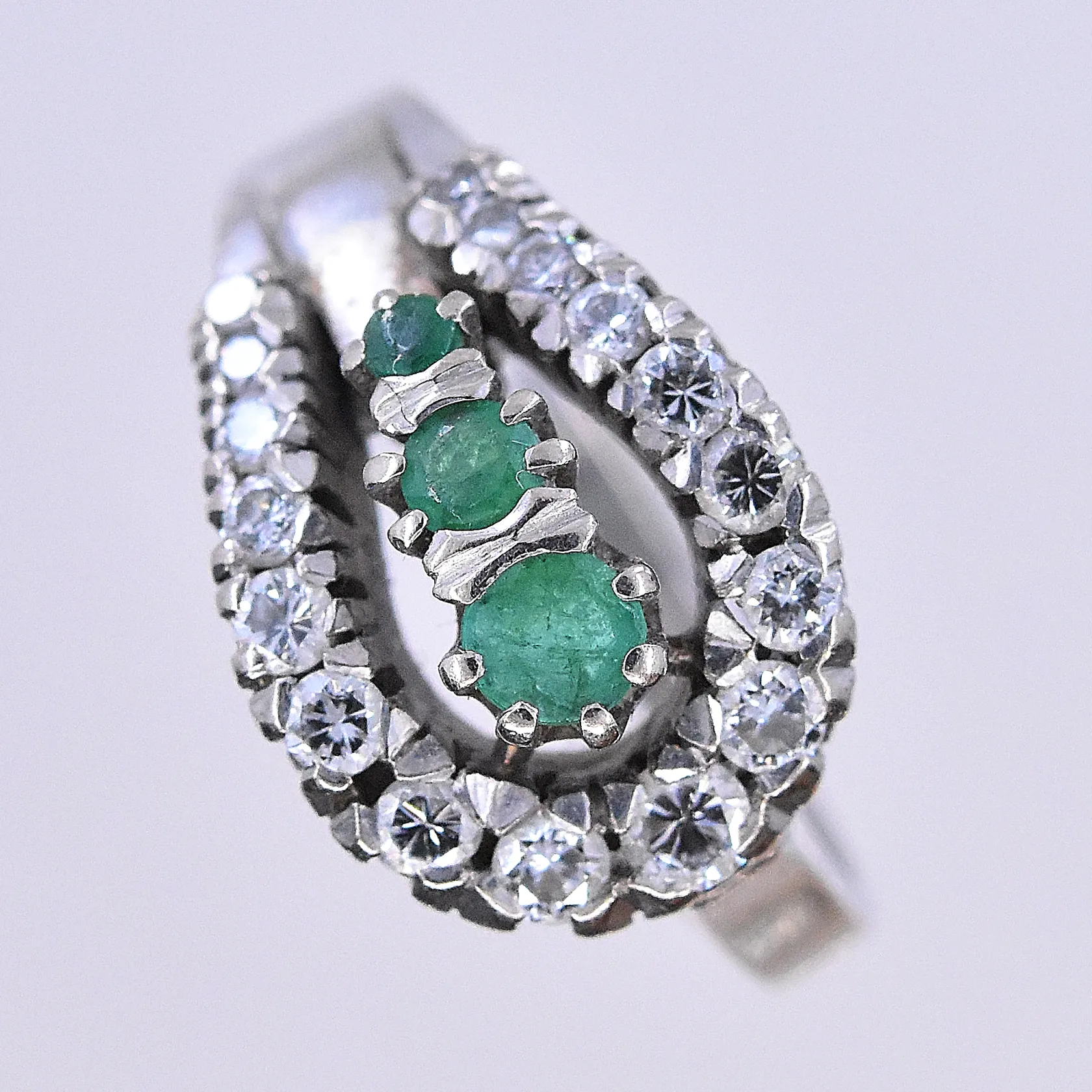 Ring med diamanter 4x0,01ct 4x0,02ct 6x0,03ct 3x0,05ct och gröna stenar stl:17, bredd 3-12 mm, vitguld, 18K. Vikt: 7,3 g.