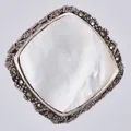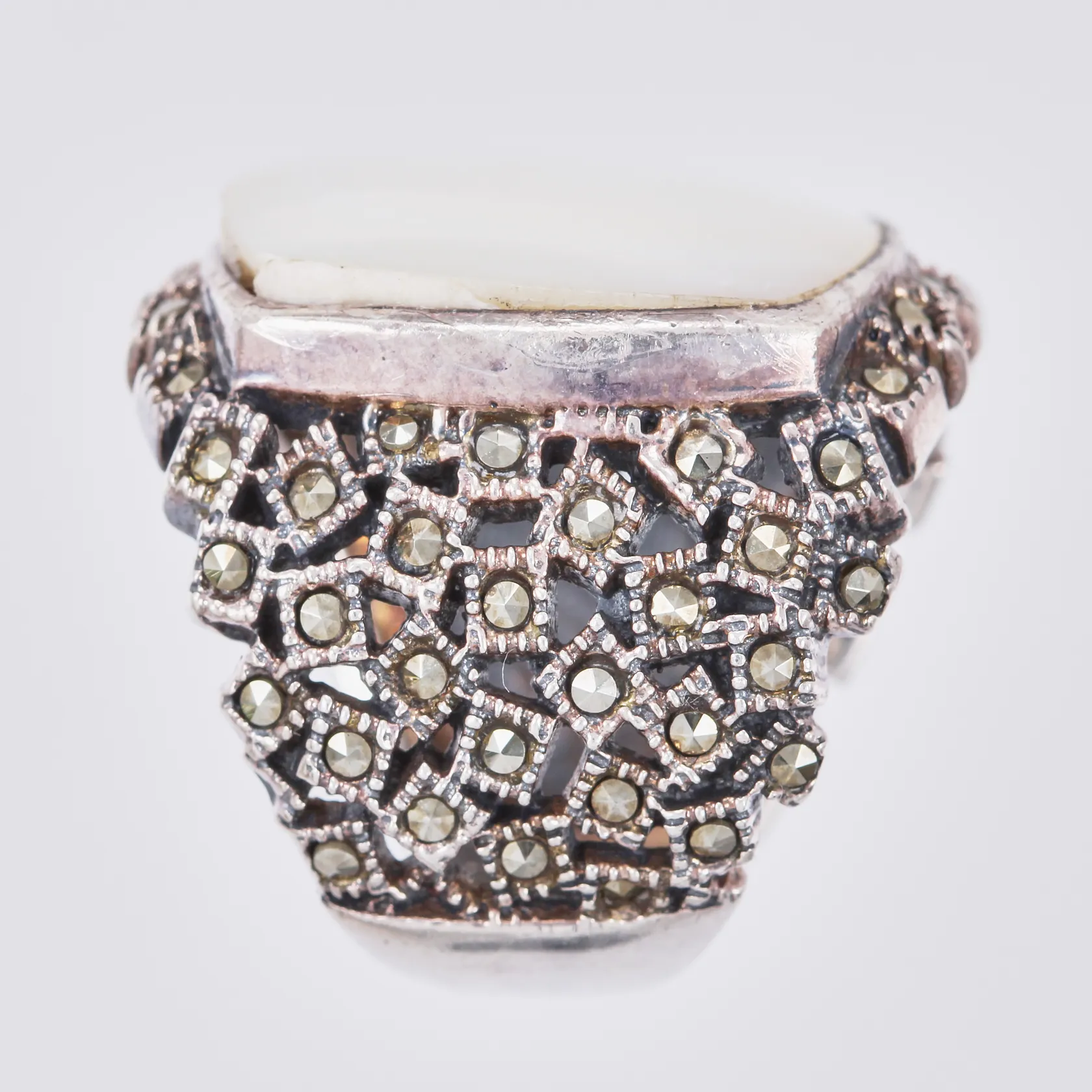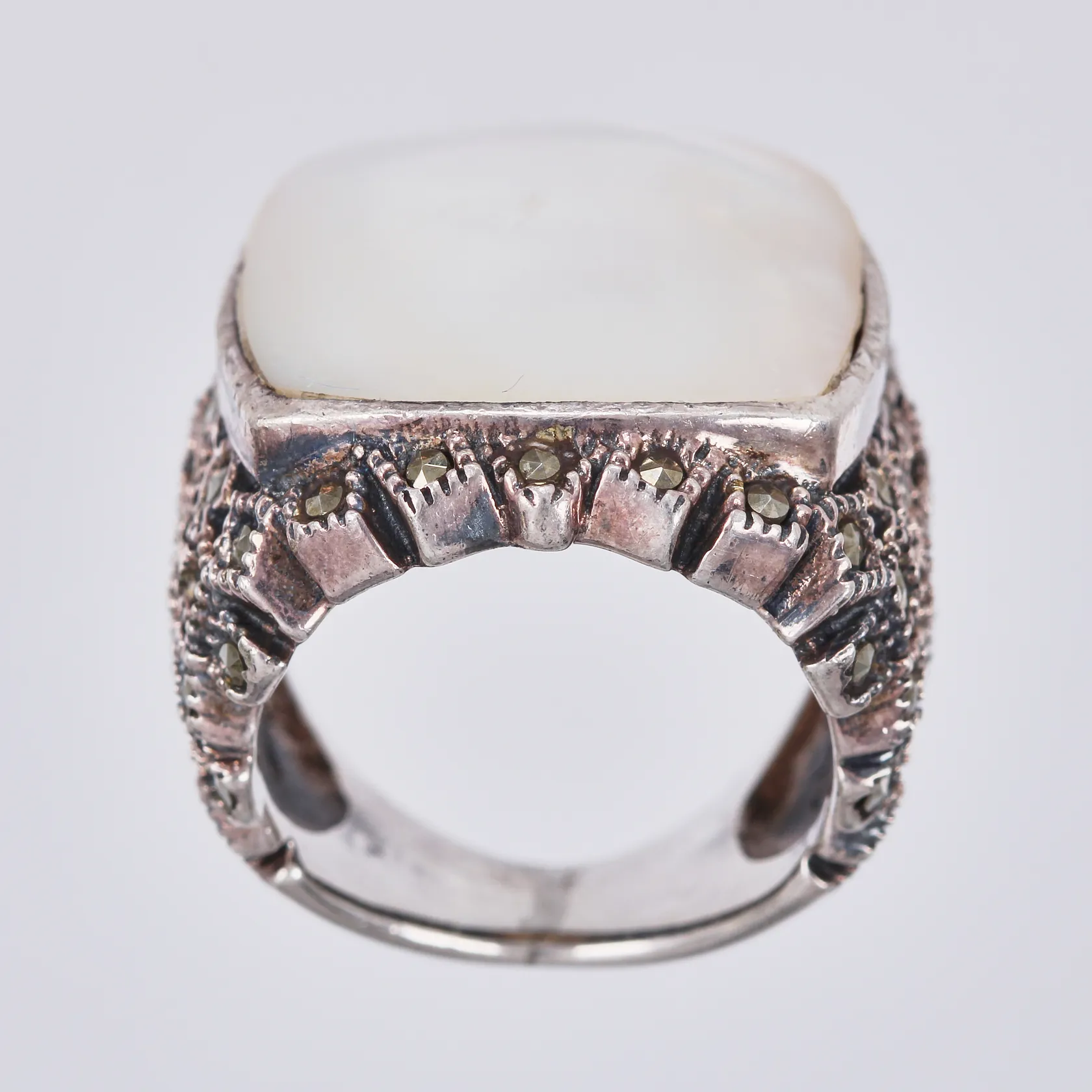 Ring med pärlemor och markasiter stl: 18 bredd: ca 6-25mm 925/1000, silver Vikt: 18,7 g.